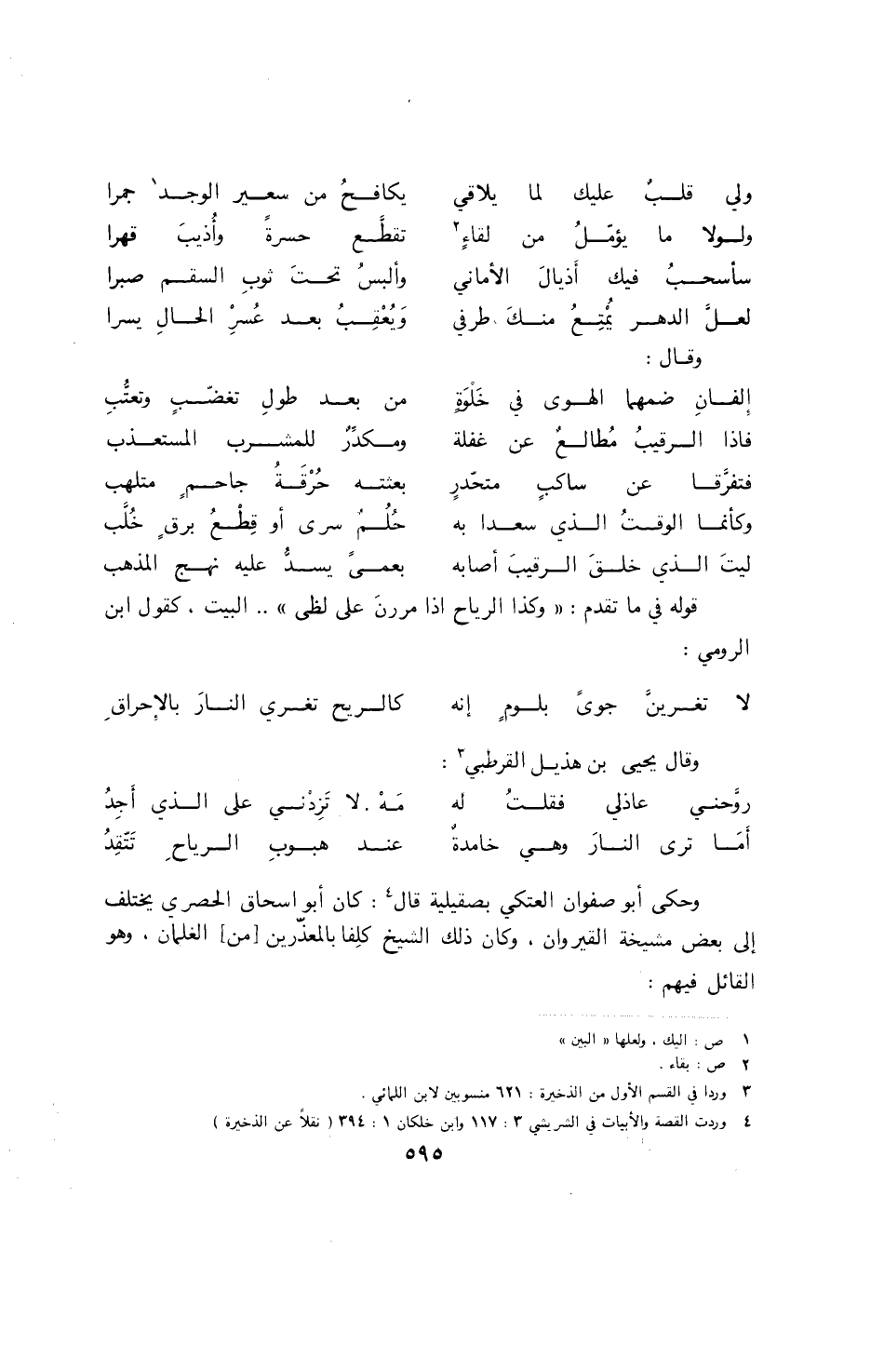 فقال له الشيخ: يا حصري، ماذا تقول في من هام بهذا القد، وصبا بهذا الخد - قال له الحصري: الهيمان به والله غاية الظرف، والصبوة إليه من تمام اللطف، لا سيما إذا شاب كافور (1) خده ذلك المسك الفتيت، وهجم على صبحه ذلك الليل البهيم، والله ما خلت سواده في بياضه إلا بياض الإيمان في سواد الكفر (2) وغيهب الظلماء في منير الفجر. فقال: صفه يا حصري، قال: من ملك رق القول حتى انقادت له صعابه، وذلل له جموحه حتى سطع له شهابه، أقعد مني بذلك، فقال: صفه، فإني معمل (3) فكري في ذلك، فأطرقا ساعة فقال الحصري (4) :