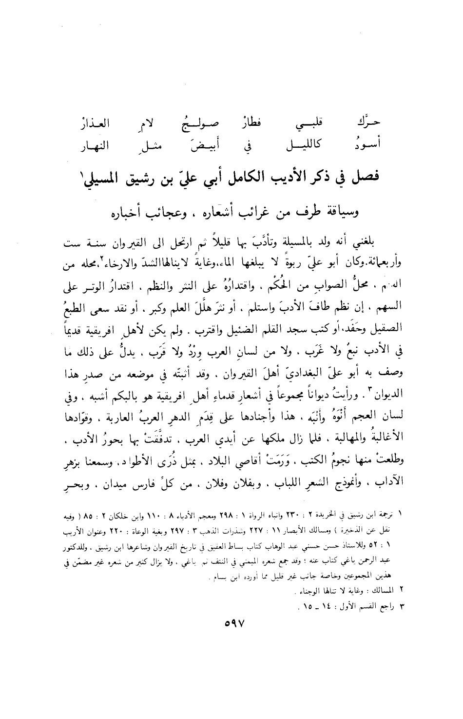 بلاغة وبيان، وقال أبو علي بن رشيق، وما أبو علي - شعاع القمر، وحديث السمر، ومعجزة الخُبر والخبر، فات الأواخر والأوائل، واسكت المناظر والمماثل.