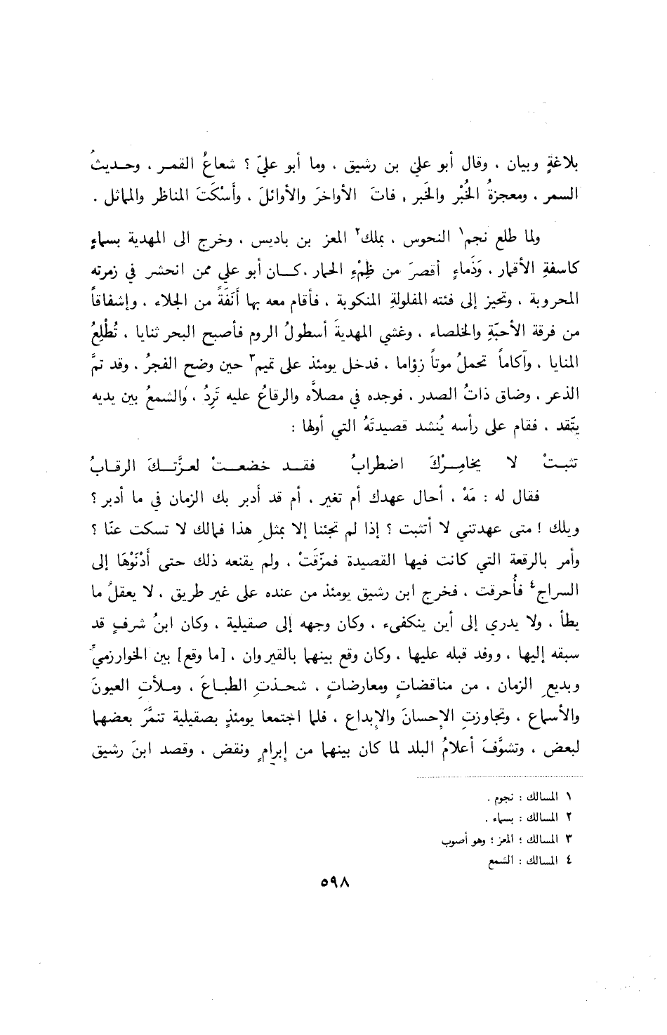 بعض إخوانه وقال له: أنتما علما الإحسان، وشيخا أهل القيروان، وقد أصبحتما بحال جلاء، وبين أعداء (1) ، والأشبه بكما ألا تفريا أديمكما، ولا تطعما الأعداء لحومكما، فقد كان يحميكما السلطان، ويمحو كثيراً من مساويكما الإخوان، فقال له: إيت ابن شرف فخذ عهده بذلك، فلست أنا أراجعك فيما هنالك، فأتاه وكان أمراً صدقٍ، فوجده أجنح للسلم، وأدنى إلى الحلم، برئ إليه من صببه وصعده، وأعطاه على الوفاء بذلك صفقتي لسانه ويده، فكان ابن رشيق بعد ذلك ربما أعرض وعرض (2) ، وتحلب إلى شيء من تلك الهنات أو تهلمظ، وأما ابن شرف فلم يحل ما عقد، ولا حال عما عهد.