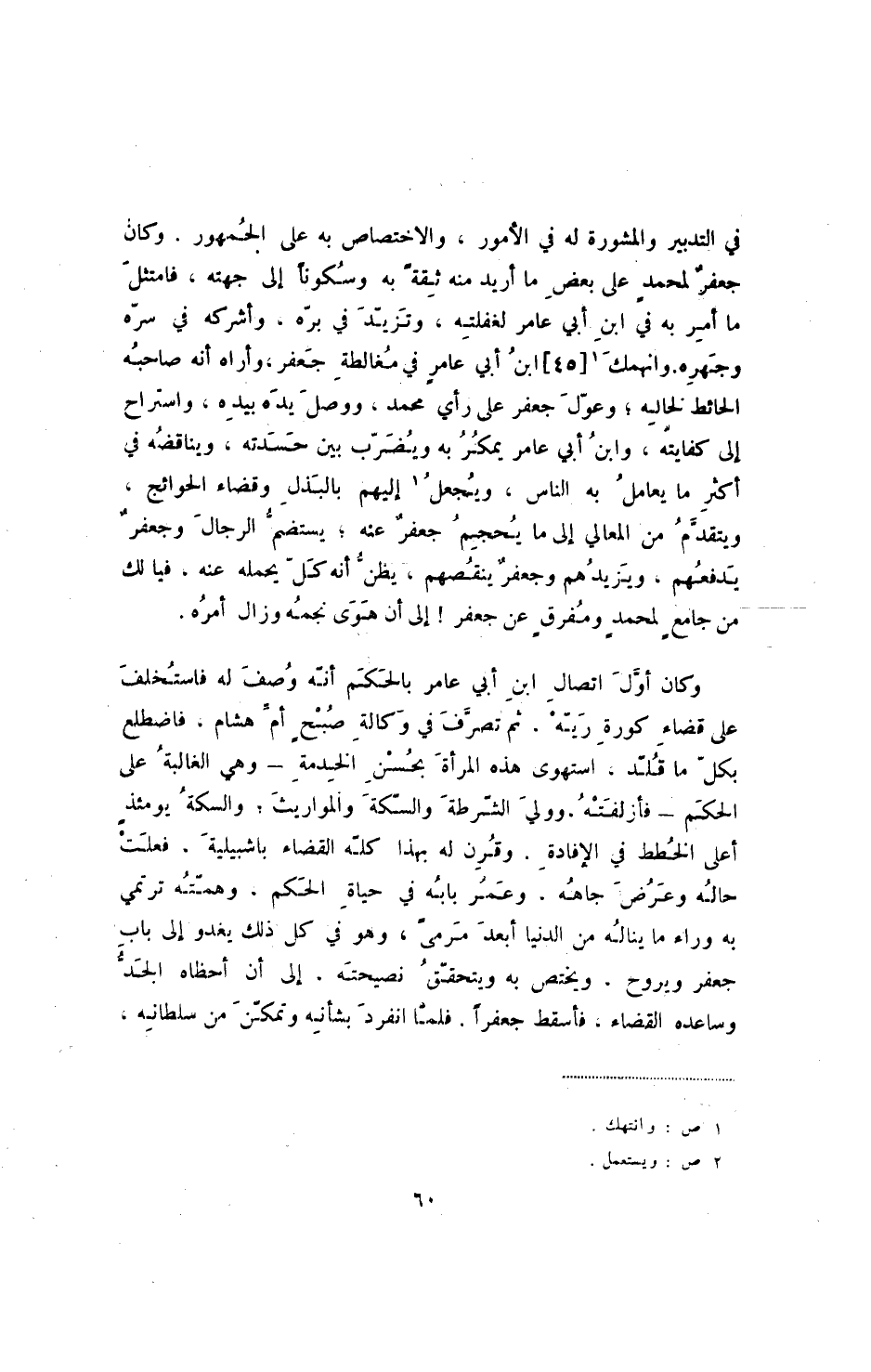 في التدبير والمشورة له في الأمور، والاختصاص به على الجمهور. وكان جعفر لمحمدٍ على بعض ما أريد منه ثقةً به وسكوناً إلى جهته، فامتثل ما أمر به في ابن أبي عامر لغفلته، وتزيد في بره، وأشركه في سره وجهره. وانهمك [45] ابن أبي عامر في مغالطة جعفر، وأراه أنه صاحبه الحائط لخاله؛ وعول جعفر على رأي محمد، ووصل يده بيده، واستراح إلى كفايته، وابن أبي عامر يمكر به ويضرب بين حسدته، ويناقضه في أكثر ما يعامل به الناس، ويجعل إليهم بالبذل وقضاء الحوائج، ويتقدم من المعالي إلى ما يحجم جعفر عنه؛ يستضم الرجال وجعفر يدفعهم، ويزيدهم وجعفر ينقضهم، يظن أنه كل يحمله عنه، فيا لك من جامع لمحمدٍ ومفرقٍ عن جعفر! إلى أن هوى نجمه وزال أمره.