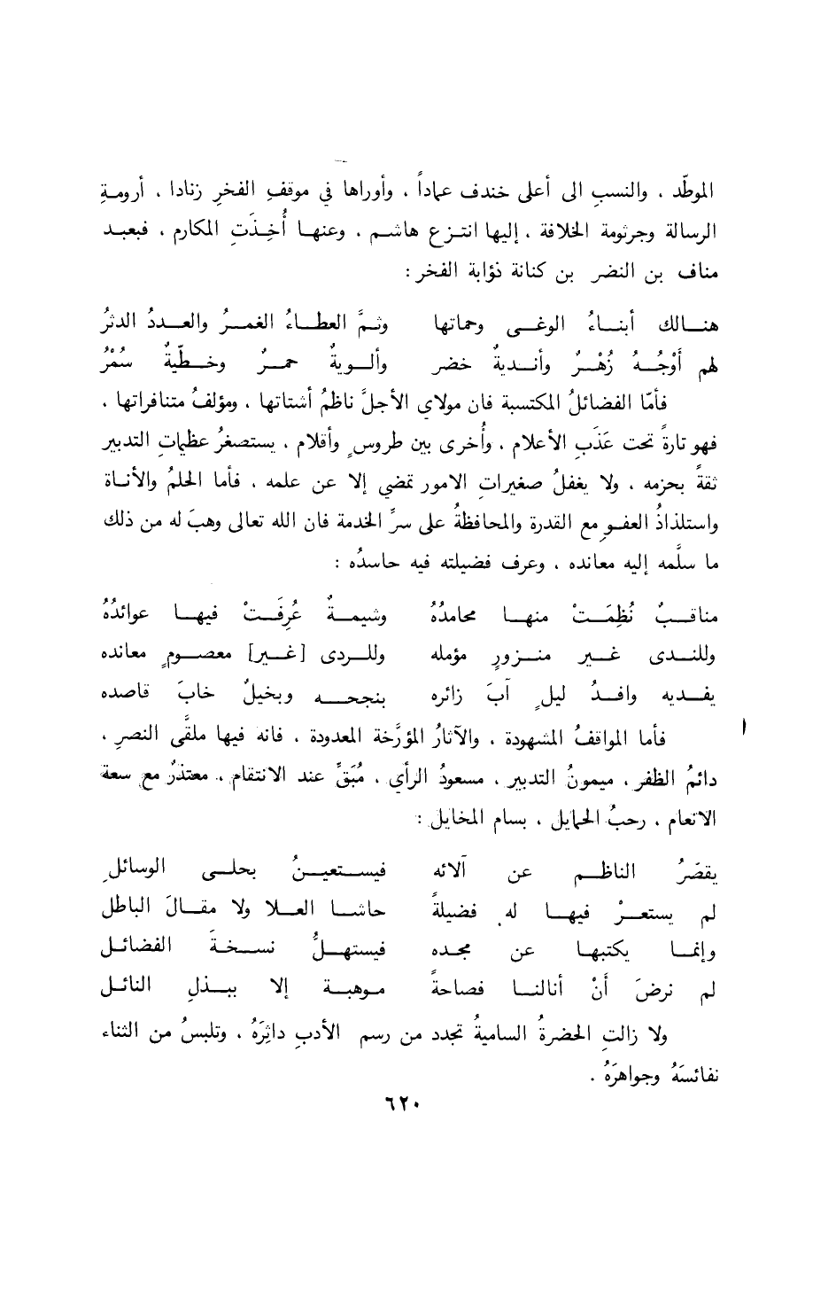 الموطد، والنسب إلى أعلى خندف عماداً، وأوراها في موقف الفخر زنادا، أرومة الرسالة وجرثومة الخلافة، إليها انتزع هاشم، وعنها أخذت المكارم، فبعبد مناف بن النضر بن كنانة ذؤابة الفخر: