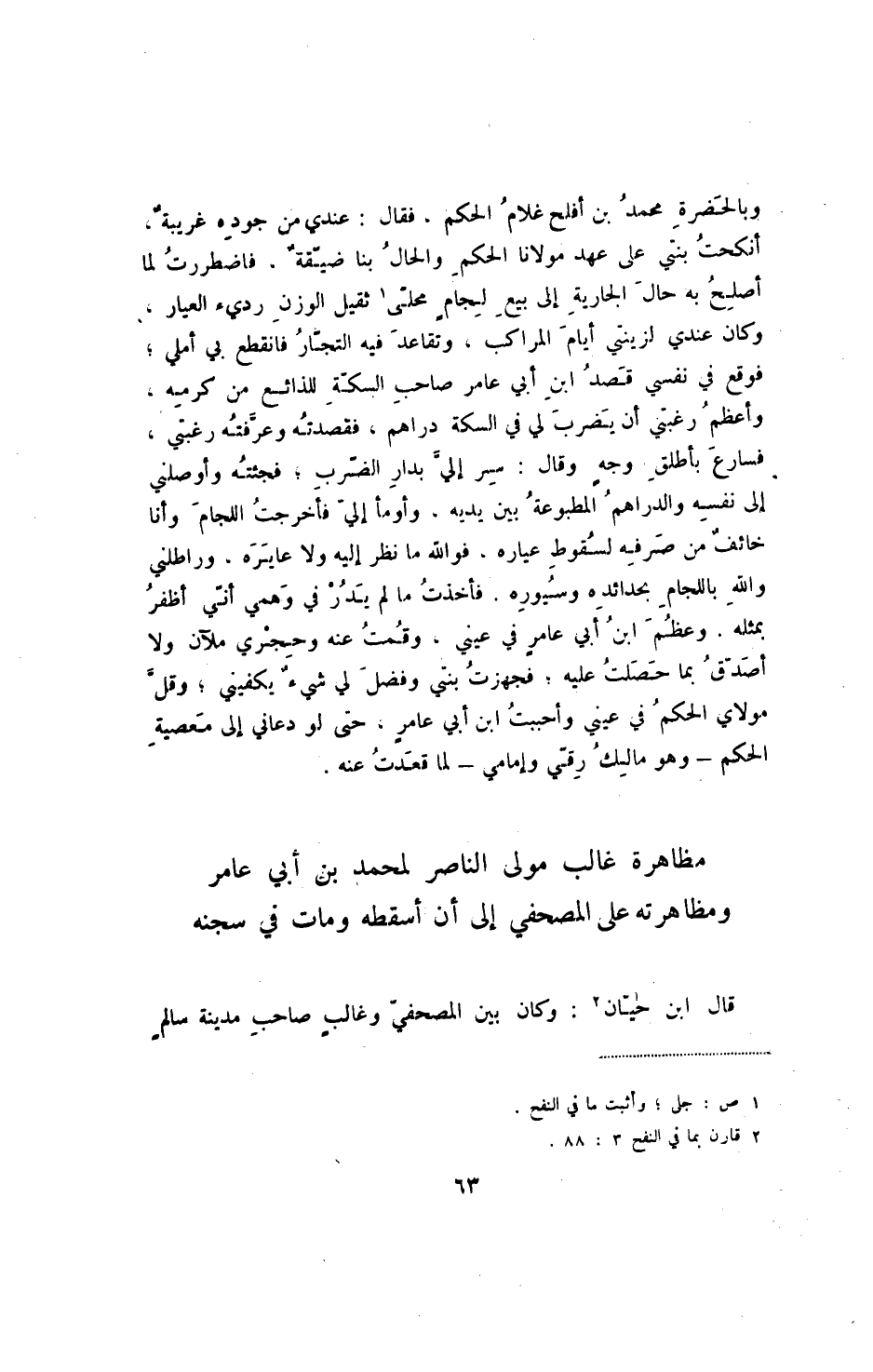وبالحضرة محمد بن أفلح غلام الحكم، فقال: عندي من جوده غريبة، أنكحت بنتي على عهد مولانا الحكم والحال بنا ضيقة، فاضطررت لما أصلح به حال الجارية إلى بيع لجام محلى ثقيل الوزن رديء العيار، وكان عندي لزينتي أيام المراكب، وتقاعد فيه التجار فانقطع بي أملي؛ فوقع في نفسي قصد ابن أبي عامر صاحب السكة للذائع من كرمه، وأعظم رغبتي أن يضرب لي في السكة دراهم، فقصدته وعرفته رغبتي، فسارع بأطلق وجه وقال: سر إليّ بدار الضرب؛ فجئته وأوصلني إلى نفسه والدراهم المطبوعة بين يديه، وأومأ إليّ فأخرجت اللجام وأنا خائف من صرفه لسقوط عياره، فوالله ما نظر إليه ولا عايره، وراطلني والله باللجام بحدائده وسيوره. فأخذت ما لم يدر في وهمي أني أظفر بمثله. وعظم ابن أبي عامر في عيني، وقمت عنه وحجري ملآن ولا أصدق بما حصلت عليه؛ فجهزت بني وفضل لي شيء يكفيني؛ وقل مولاي الحكم في عيني وأحببت ابن أبي عامر، حتى لو دعاني إلى معصية الحكم - وهو مالك رقي وإمامي - لما قعدت عنه.