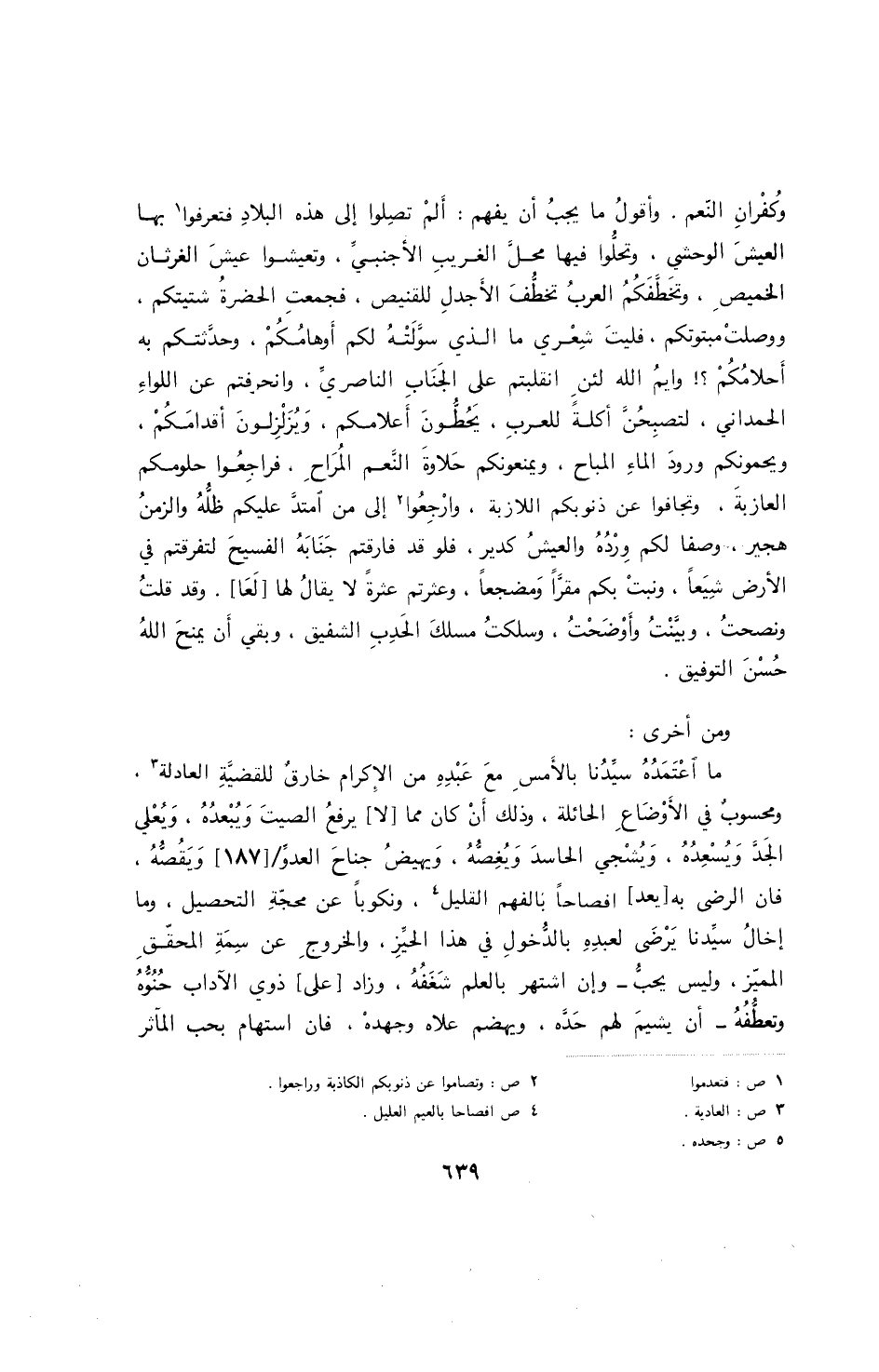 معلوم أن الزمان قد عادانا بعجابه (4) ، ونهشنا بأنيابه، وأدار علينا من صروف أحداثه كؤوساًن وجعل كل غريب لنا أنيساً، ولما خرج عن حكم العادة، وسلك في مولاي غير الجادة، وأودعه عوارف يضيق عنها باع الكتاب، وقذف إليه أقاصي خطوب الخطاب، علمنا أنه قد أصاب رشده، وأوجب حمده، وأطلع شمس النهار من مشرقها، ووضع تاج الرياسة على مفرقها.