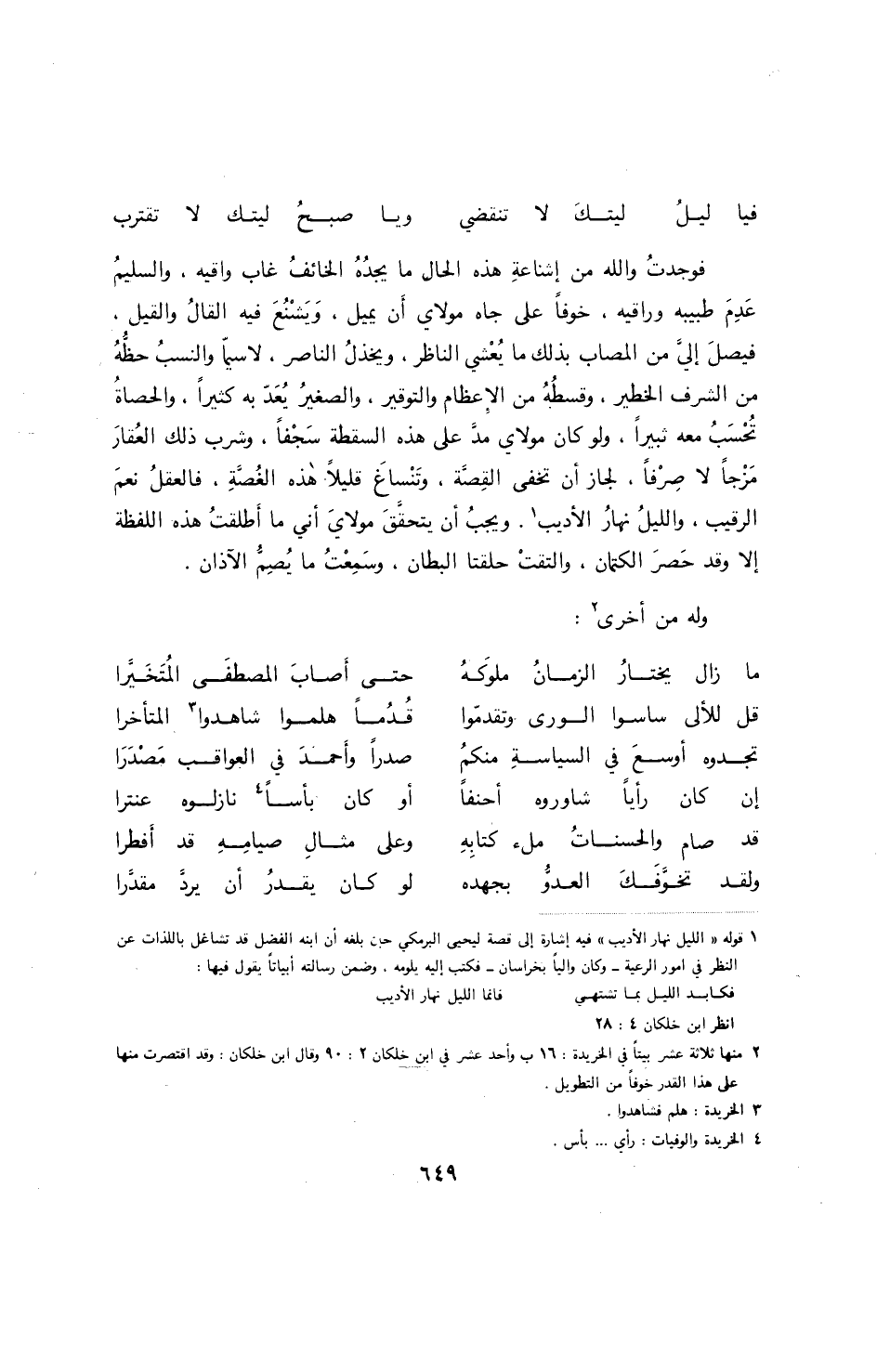 فلا برحت الحضرة - حرس الله أيامها - تفتر (4) عن مباسمها الحسان، وتفتخر بمناقبها قبائل غسان، فلو شاهد أهل جفنة (5) جفانها، وأهل جبلة بن الأيهم ضرابها وطعانها، لعلموا (6) أن الله أتاح السماحة والبسالة ملكاً منهم يحفظ ما ضيعه الناس من عهود، ويسرح ما ذخروه من نقودها، فما يزيد المدح مناقبه ضياء، ولا مراتبه اعتلاء، وإنما هو في ذلك كالمسك يطيب بنفسه (7) طبعاً، ويزيد المحارض (8) تضوعاً ونشراً، وإن أطال العبد في نشر فضائلها مقوده، واستخدم في ذلك لسانه ويده، فإنما هو كمن يوقد في الشمس ذبالاً، ويهدي إلى الفرات نطافاً أوشالاً، والذي مد الأرض وجعل فيها رواسي وأنهاراً، يجعل أمداد (9) النعيم على