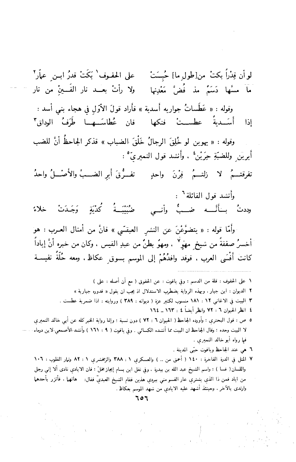 وأما مراضع ثعالة فيقال: هو أعطش من ثعالة (2) ، رجلٍ من بني مجاشع، كان ضل الطريق هو وابن عم له، فعطشا، فالتقم كل واحدٍ منهما أير صاحبه يشرب بوله، فلم يغنيا عنهما شيئاً وماتا عطشاً، فوجدا على تلك الحال؛ ولذلك قال جرير يعير بني دارم (3) :