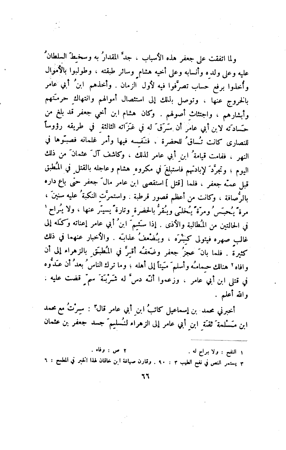 ولما اتفقت على جعفر هذه الأسباب، جد المقدار به وسخط السلطان عليه وعلى ولده وأنسابه وعلى أخيه هشام وسائر طبقته، وطولبوا بالأموال وأخذوا برفع حساب تصرفوا فيه لأول الزمان. وأخذهم ابن أبي عامر بالخروج عنها، وتوصل بذلك إلى استئصال أموالهم وانتهاك حرمتهم وأبشارهم، واجتثاث أصولهم. وكان هشام ابن أخي جعفر قد بلغ من حسادته لابن أبي عامر أن سرق له في غزاته الثالثة في طريقه رؤوساً للنصارى كانت تساق للحضرة، فنفسه فيها وأمر غلمانه فصبوها في النهر، فقامت قيامة ابن أبي عامر لذلك، وكاشف آل عثمان من ذلك اليوم؛ وتجرد لإبادتهم فاستبلغ في مكروه هشام عاجله بالقتل في المطبق قبل عمه جعفر، فلما [قتل] استقصى ابن عامر مال جعفر حتى باع داره بالرصافة، وكانت من أعظم قصور قرطبة. واستمرت النكبة عليه سنين، مرة يحبس ومرة يخلى ويقر بالحضرة وتارة يسير عنها، ولا يراح في الحالتين من المطالبة والأذى. إذا سئم ابن أبي عامر إعناته وكله إلى غالب صهره فيتولى كبره، ويضعف عذابه. والأخبار عنهما في ذلك كثيرة. فلما بان عجز جعفر وضعفه أقر في المطبق بالزهراء إلى أن وافاه هنالك حمامه وأسلم ميتاً إلى أهله؛ وما ترك الناس بعد أن عدوه في قتلى ابن أبي عامر، وزعموا أنه دس له شربة سم قضت عليه. والله أعلم.