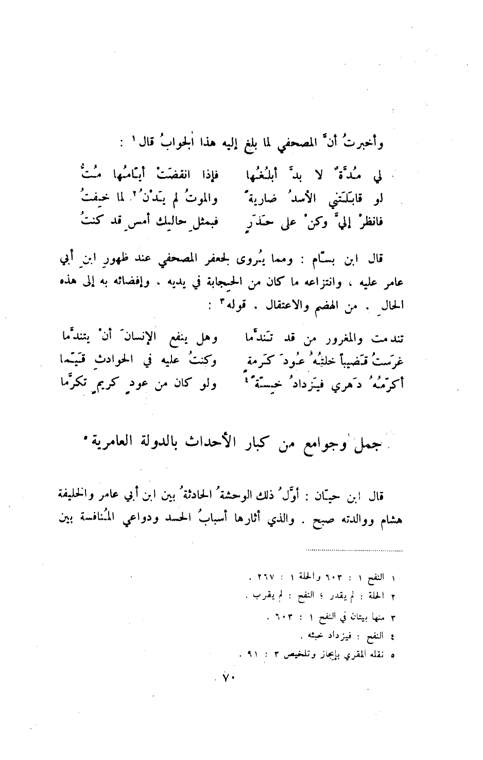 فانظر إليّ وكن على حذر ... فبمثل حالك أمس قد كنت قال ابن بسام: ومما يروى لجعفر المصحفي عند ظهور ابن أبي عامر عليه، وانتزاعه ما كان من الحجابة في يديه، وإفضائه به إلى هذه الحال، من الهضم والاعتقال، قوله: