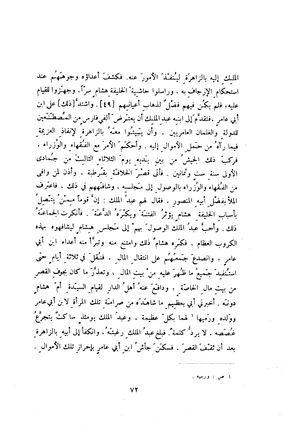 الملك إليه بالزاهرة لينفذ الأمور عنه. فكشف أعداؤه وجوههم عند استحكام الإرجاف به، وراسلوا حاشية الخليفة هشام سراً، وجهزوا للقيام عليه؛ فلم يكن فيهم فضل لذهاب أعيانهم [49] . واشتد [ذلك] على ابن أبي عامر، فتقدم إلى ابنه عبد الملك أن يعترض ألفي فارس من المصطنعين للدولة والغلمان العامريين، وأن يبيتوا معه بالزاهرة لإنفاذ العزيمة فيما رآه من حمل الأموال إليه. وأحكم الأمر مع الفقهاء والوزراء، فركب ذلك الجيش من بين يديه يوم الثلاثاء الثالث من جمادى الأولى سنة ست وثمانين، فأتى قصر الخلافة بقرطبة، وأذن لمن وافى من الفقهاء والوزراء بالوصول إلى مجلسه، وشافههم في ذلك، فاعترف الملأ بفضل أبيه المنصور، فقال لهم عبد الملك: إن قوماً ممن يتصل بأسباب الخليفة هشام يؤثر الفتنة ويكره الدعة. فأنكرت الجماعة ذلك. وأحب عبد الملك والوصول بهم إلى مجلس هشام لشافهوه بهذه الكروب العظام. فكره هشام ذلك وامتنع منه وتبرأ منه أعداء ابن أبي عامر؛ وانصدع جمعهم على انتقال المال، فنقل في ثلاثة أيام حتى استنفذ جميع ما ظهر عليه من بيات المال، وتعذر ما كان بجوف القصر من بيت مال الخاصة؛ ودافع عنه أهل الدار لقيام السيدة أم هشام دونه. أخبرني أبي بعظيم ما شاهده من صرامة تلك المرأة لابن أبي عامر وولده ورميها لهما بكل عظيمة، وعبد الملك يومئذ ساكت يتجرع غصصه، لا يرد كلمة. فبلغ عبد الملك رغبته، وانكفأ إلى أبيه بالزاهرة بعد أن ثقف القصر، فسكن جأش ابن أبي عامر بإحراز تلك الأموال