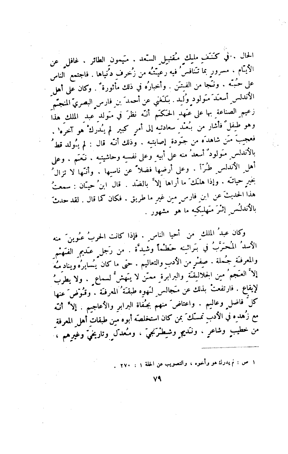 الحال، في كنف ملك مقتبل السعد، ميمون الطائر، غافل عن الأيام، مسرور بما تنافس فيه رعيته من زخرف دنياها، فاجتمع الناس على حبه، ونجا من الفتن. وأخباره في ذلك مأثورة. وكان على أهل الأندلس أسعد مولود ولد. بلغني عن أحمد بن فارس البصري المنجم زعيم الصناعة بها على عهد الحكم أنه نظر في مولد عبد الملك هذا وهو طفل فأشار من بعد سعادته إلى أمر كبير لم يدرك هو آخره، فعجب من شاهده من جودة إصابته، وذلك أنه قال: لم يولد قط بالأندلس مولود أسعد منه على أبيه وعلى نفسه وحاشيته، نعم، وعلى أهل الأندلس طراً، وعلى أرضها فضلاً عن ناسها، وأنها لا تزال بخير حياته، وإذا هلك ما أراها إلا بالضد. قال ابن حيان: سمعت هذا الحديث عن ابن فارس من غير ما طريق، فكان كما قال، لقد حدث بالأندلس إثر مهلكه ما هو مشهور.