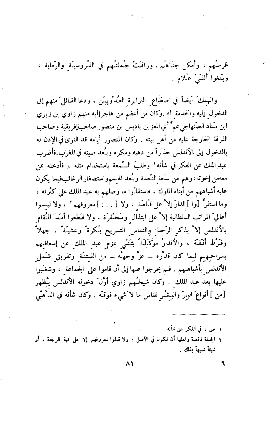 وانهمك أيضاً في اصطناع البرابرة العدويين، ودعا القبائل منهم إلى الدخول إليه والخدمة له. وكان من أعظم من هاجر إليه منهم زاوي بن زيري ابن مناد الصنهاجي عم أبي المعز بن باديس بن منصور صاحب إفريقية وصاحب الفرقة الخارجة عليه من أهل بيته. وكان المنصور أيامه قد التوى في الإذن له بالدخول إلى الأندلس حذراً من دهيه ومكره وبعد صيته في المغرب. فأضرب عبد الملك عن الفكر في شأنه وطلب السمعة باستخدام مثله، فأدخله بمن معه من إخوته، وهم من سعة النعمة وبعد الهمم واستصغار الرغائب فيما يكون عليه أشباههم من أبناء الملوك، فاستقلوا ما وصلهم به عبد الملك على كثرته، وما استقر [وا] الدار إلا على قلعة، ولا [....] معروفهم، ولا لبسوا أعالي المراتب السلطانية إلا على ابتذال ومحقرة، ولا قطعوا أمد المقام بالأندلس إلا بذكر الرحلة والتماس التسريح بكرة وعشية، جهلاً وفرط أنفة، والأقدار موكلة بثني عزم عبد الملك عن إسعافهم بسراحهم لما كان قدره - عز وجهه - من الفتنة وتفريق شمل الأندلس بأشباههم، فلم يخرجوا عنها إلى أن قاموا على الجماعة، وشغبوا عليها بعد عبد الملك. وكان شيخهم زاوي أول دخوله الأندلس يظهر [من] أنواع البر والبشر للناس ما لا شيء فوقه. وكان شأنه في الدهي