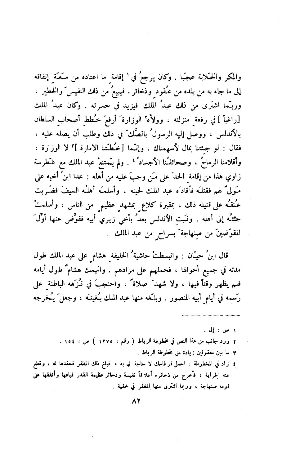 قال ابن حيان: وانبسطت حاشية الخليفة هشام بن عبد الملك طول مدته في جميع أحوالها، فحملهم على مرادهم. وانهمك هشام طول أيامه فلم يظهر وقتاً فيها، ولا شهد صلاة، واحتجب في نزهة الباطنة على رسمه في أيامه أبيه المنصور. وبلغه منها عبد الملك بغيته، وجعل يخرجه