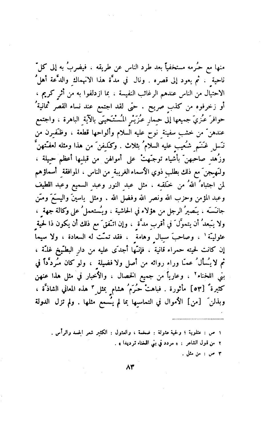 منها مع حرمه مستخفياً بعد طرد الناس عن طريقه، فيضرب به إلى كل ناحية. ثم يعود إلى قصره. ونال في مدة هذا الإنهماك والدعة أهل الاحتيال من الناس عندهم الرغائب النفيسة، بما ازدلفوا به من أثر كريم، أو زخرفوه من كذب صريح، حتى لقد اجتمع عند نساء القصر ثمانية حوافر عزي جميعها إلى حمار عزيز المستحيى بالآية الباهرة، واجتمع عندهن من خشب سفينة نوح عليه السلام وألواحها قطعة، وظفرن من نسل غنم شعيب عليه السلام بثلاث. وكلفن من هذا ومثله لعفتهن وزهد صاحبهن بأشياء توجهت على أموالهن من قبلها أعظم حيلة، ولهجن مع ذلك بطلب ذوي الأسماء الغريبة من الناس، الموافقة أسماؤهم لمن اجتباه الله من خلقه. مثل عبد النور وعبد السميع وعبد اللطيف وعبد المؤمن وحزب الله ونصر الله وفضل الله، ومثل ياسين واليسع ومن جانسه، يصير الرجل من هؤلاء في الحاشية، ويستعمل على وكالة جهة، ولا يبعد أن يتمول في أقرب مدة، وإن اتفق مع ذلك أن يكون ذا لحية عثولية، وصاحب سبال وهامة، فقد تمت له السعادة، ولا سيما إن كانت لحيته حمراء قانية، فإنها أجدى عليه من دار البطيخ غلة، ثم لا يسأل عما وراء روائه من أصل ولا فضيلة، ولو كان مردداً في بني اللخناء، وعارياً من جميع الخصال، والأخبار في مثل هذا عنهن كثيرة [53] مأثورة. فباهت حرم هشام بمثل هذه المعاني الشاذة، وبذلن [من] الأموال في التماسها بما لم يسمع مثلها، ولم تزل الدولة
