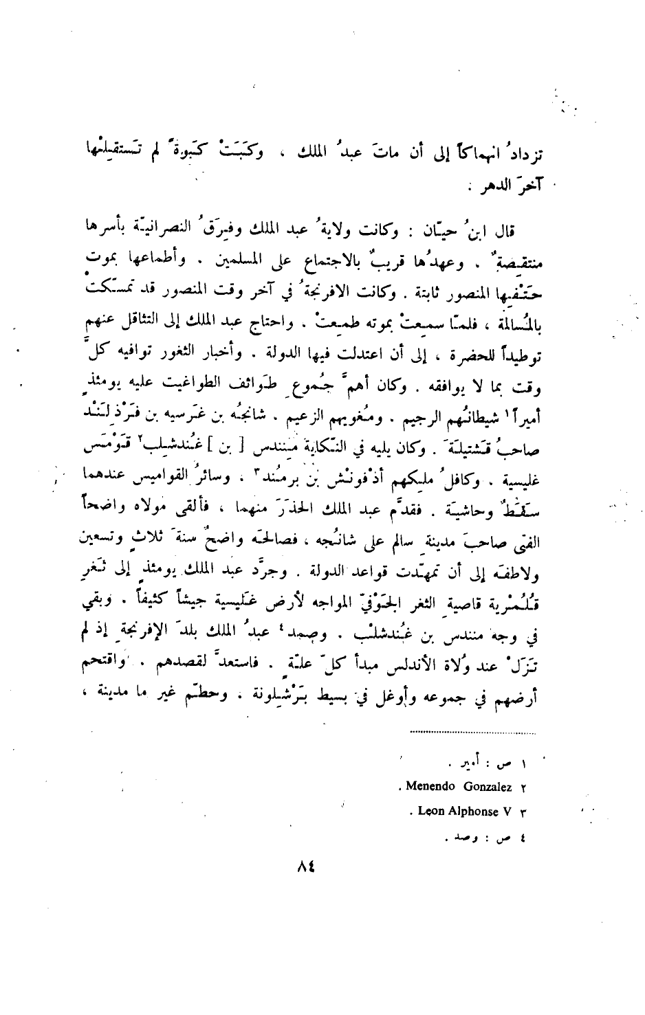 قال ابن حيان: وكانت ولاية عبد الملك وفرق النصرانية بأسرها منتقصة، وعهدها قريب بالاجتماع على المسلمين، وأطماعها بموت حتفها المنصور ثابتة. وكانت الأفرنجة في آخر وقت المنصور قد تمسكت بالمسالمة، فلما سمعت بموته طمعت، واحتاج عبد الملك إلى التثاقل عنهم توطيداً للحضرة، إلى أن اعتدلت فيها الدولة، وأخبار الثغور توافيه كل وقت بما لا يوافقه. وكان أهم جموع طوائف الطواغيت عليه يومئذ أميراً شيطانهم الرجيم، ومغويهم الزعيم، شانجه بن غرسيه بن فرذلند صاحب قشتيلة. وكان يليه في النكاية منتدس [بن] عندشلب قومس غليسية، وكافل ملكهم أذفونش بن برمند، وسائر القواميس عندهما سقط وحاشية. فقدم عبد الملك الحذر منهما، فألقى مولاه واضحاً الفتى صاحب مدينة سالم على شانجه، فصالحه واضح سنة ثلاث وتسعين ولاطفه إلى أن تمهدت قواعد الدولة. وجرد عبد الملك يومئذ إلى ثغر قلمرية قاصية الثغر المواجه لأرض غليسية جيشاً كثيفاً، وبقي في وجه منتدس بن عندشلب، وصمد عبد الملك بلد الإفرنجة إذ لم تزل عند ولاة الأندلس مبدأ كل علة. فاستعد لقصدهم، واقتحم أرضهم في جموعه وأوغل في بسيط برشلونة، وحطم غير ما مدينة