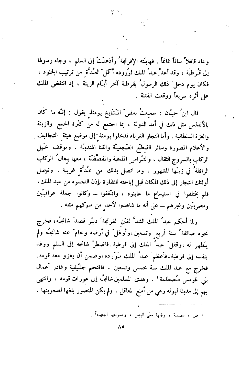 وعاد قافلاً سالماً غانماً. فهابته الإفرنجة وأذعنت إلى السلكن وجاء رسولها إلى قرطبة، وقد أعد عبد الملك لوروده أكمل العدة من ترتيب الجنود، فكان يوم دخل ذلك الرسول بقرطبة آخر أيام الزينة، إذ انتقض الملك على أثره سريعاً ووقعت الفتنة.