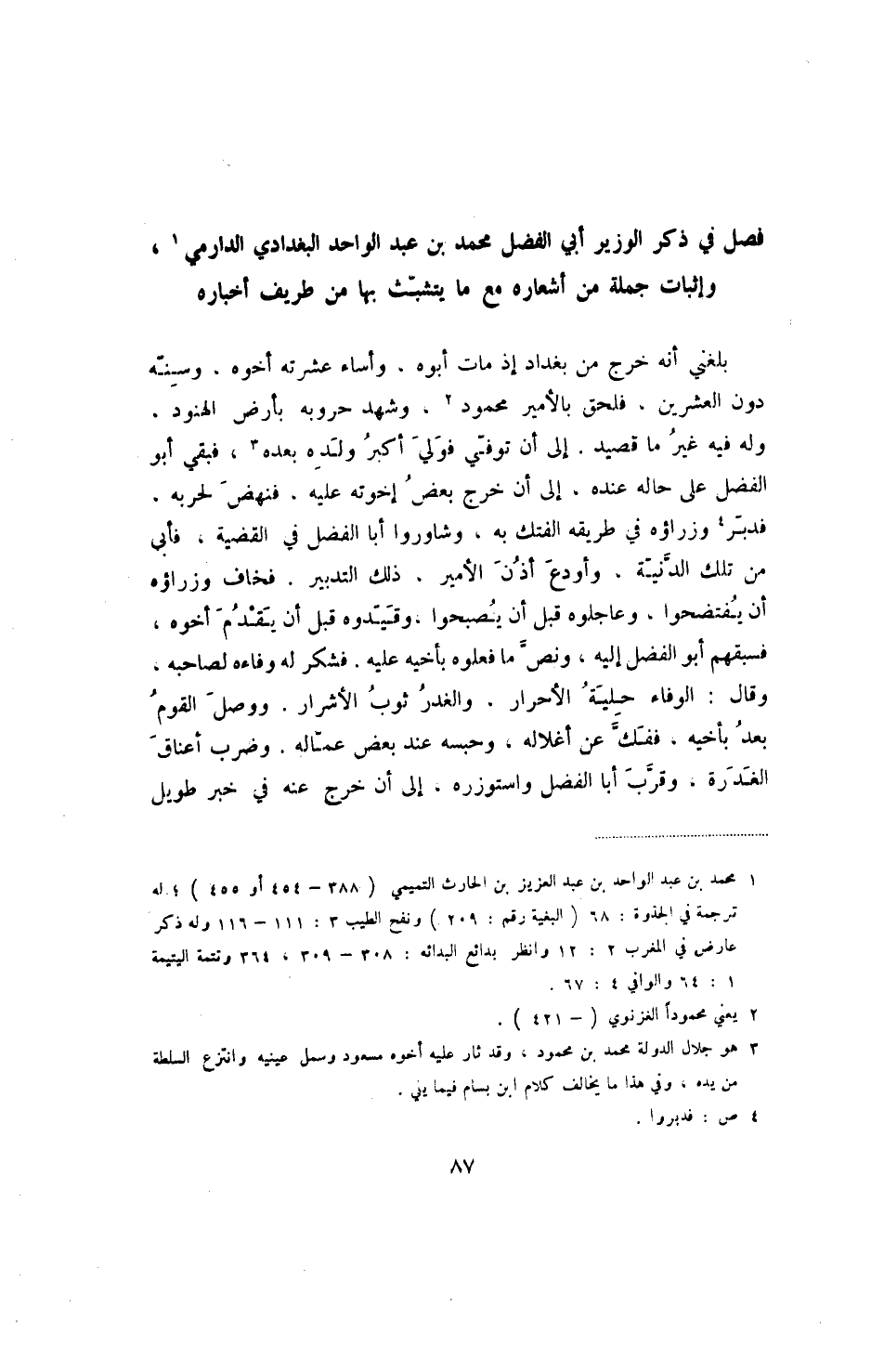 فصل في ذكر الوزير أبي الفضل محمد بن عبد الواحد البغدادي الدارمي،
