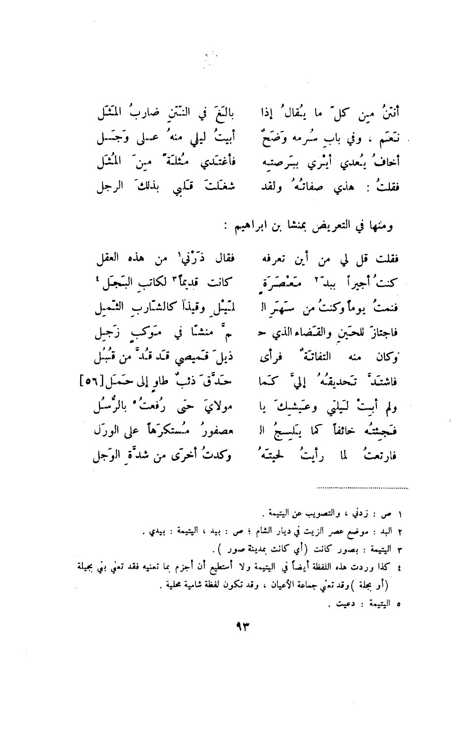 فقلت: هذي صفاته ولقد ... شغلت قلبي بذلك الرجل ومنها في التعريض بمنشا بن إبراهيم: