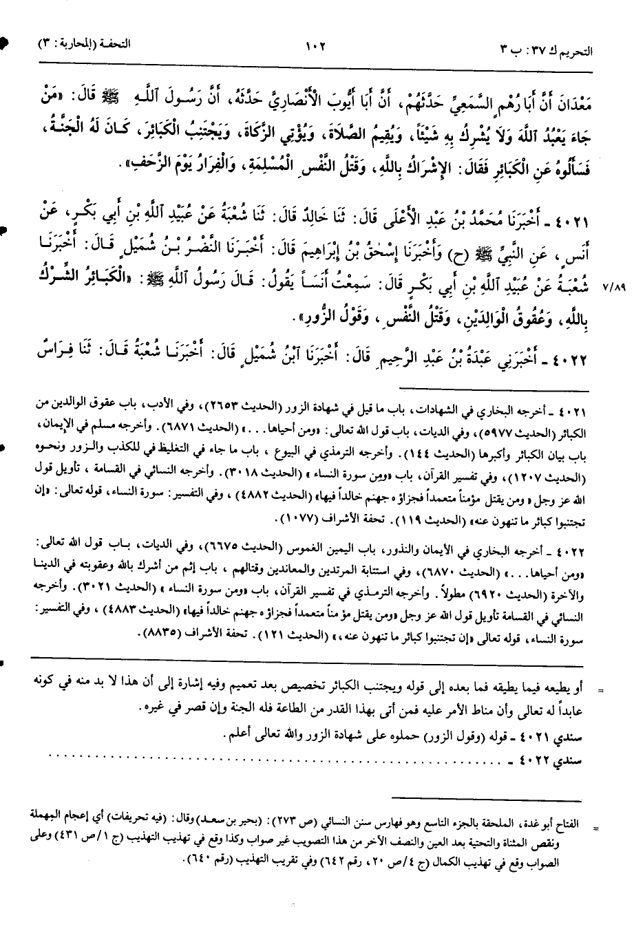 4021 - أَخْبَرَنَا مُحَمَّدُ بْنُ عَبْدِ الْأَعْلَى قَالَ حَدَّثَنَا خَالِدٌ قَالَ حَدَّثَنَا شُعْبَةُ عَنْ عُبَيْدِ اللَّهِ بْنِ أَبِي بَكْرٍ عَنْ أَنَسٍ عَنْ النَّبِيِّ صَلَّى اللَّهُ عَلَيْهِ وَسَلَّمَ ح وَأَنْبَأَنَا إِسْحَقُ بْنُ إِبْرَاهِيمَ قَالَ أَنْبَأَنَا النَّضْرُ بْنُ شُمَيْلٍ قَالَ حَدَّثَنَا شُعْبَةُ عَنْ عُبَيْدِ اللَّهِ بْنِ أَبِي بَكْرٍ قَالَ سَمِعْتُ أَنَسًا يَقُولُ قَالَ رَسُولُ اللَّهِ صَلَّى اللَّهُ عَلَيْهِ وَسَلَّمَ الْكَبَائِرُ الشِّرْكُ بِاللَّهِ وَعُقُوقُ الْوَالِدَيْنِ وَقَتْلُ النَّفْسِ وَقَوْلُ الزُّورِ
