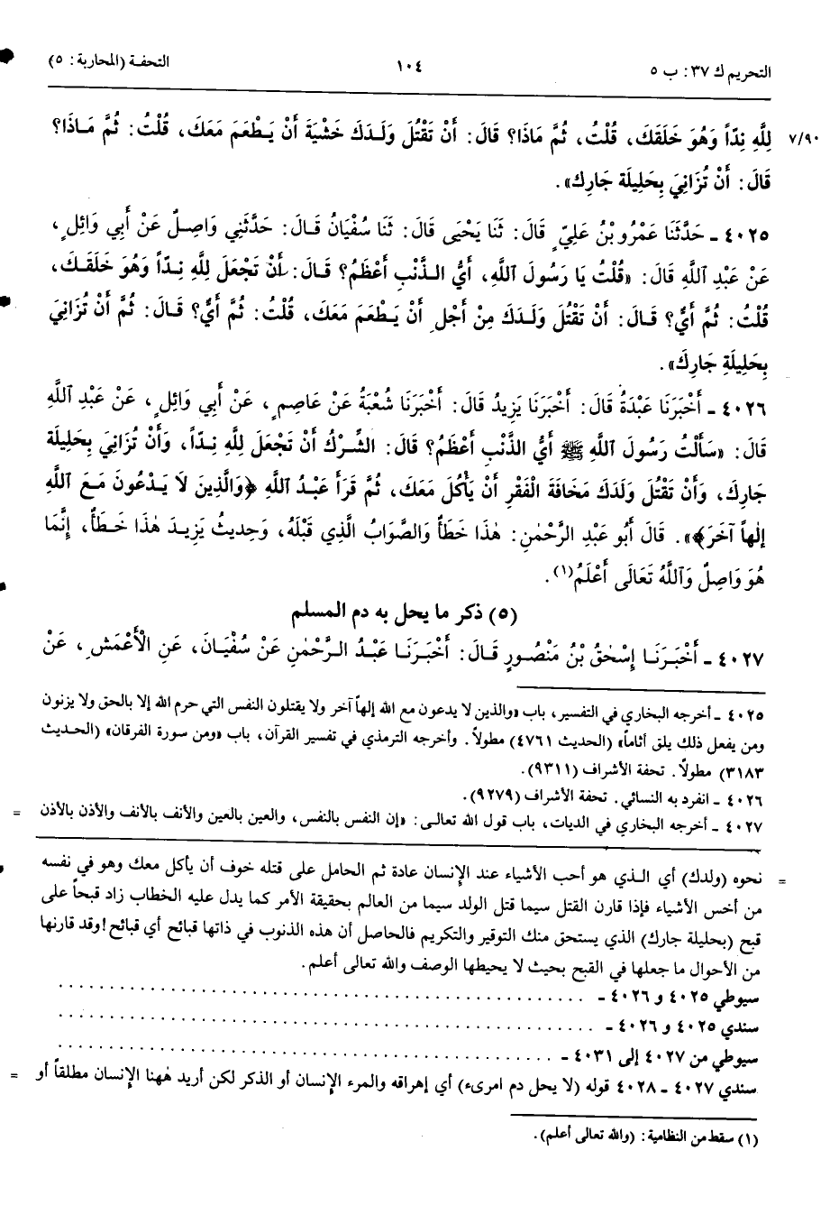 4025 - حَدَّثَنَا عَمْرُو بْنُ عَلِيٍّ قَالَ حَدَّثَنَا يَحْيَى قَالَ حَدَّثَنَا سُفْيَانُ قَالَ حَدَّثَنِي وَاصِلٌ عَنْ أَبِي وَائِلٍ عَنْ عَبْدِ اللَّهِ قَالَ قُلْتُ يَا رَسُولَ اللَّهِ أَيُّ الذَّنْبِ أَعْظَمُ قَالَ أَنْ تَجْعَلَ لِلَّهِ نِدًّا وَهُوَ خَلَقَكَ قُلْتُ ثُمَّ أَيٌّ قَالَ أَنْ تَقْتُلَ وَلَدَكَ مِنْ أَجْلِ أَنْ يَطْعَمَ مَعَكَ قُلْتُ ثُمَّ أَيٌّ قَالَ ثُمَّ أَنْ تُزَانِيَ بِحَلِيلَةِ جَارِكَ
