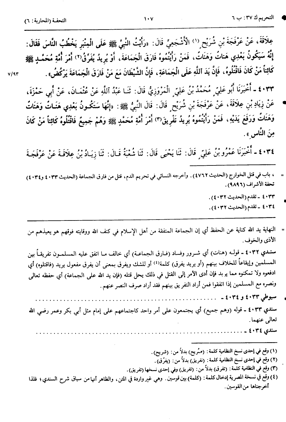 4033 - أَخْبَرَنَا أَبُو عَلِيٍّ مُحَمَّدُ بْنُ يَحْيَى الْمَرْوَزِيُّ قَالَ حَدَّثَنَا عَبْدُ اللَّهِ بْنُ عُثْمَانَ عَنْ أَبِي حَمْزَةَ عَنْ زِيَادِ بْنِ عِلَاقَةَ عَنْ عَرْفَجَةَ بْنِ شُرَيْحٍ قَالَ قَالَ النَّبِيُّ صَلَّى اللَّهُ عَلَيْهِ وَسَلَّمَ إِنَّهَا سَتَكُونُ بَعْدِي هَنَاتٌ وَهَنَاتٌ وَهَنَاتٌ وَرَفَعَ يَدَيْهِ فَمَنْ رَأَيْتُمُوهُ يُرِيدُ تَفْرِيقَ أَمْرِ أُمَّةِ مُحَمَّدٍ صَلَّى اللَّهُ عَلَيْهِ وَسَلَّمَ وَهُمْ جَمِيعٌ فَاقْتُلُوهُ كَائِنًا مَنْ كَانَ مِنْ النَّاسِ