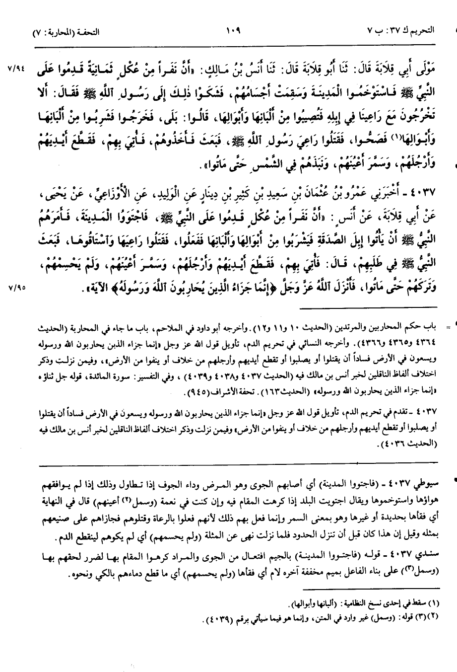 4037 - أَخْبَرَنِي عَمْرُو بْنُ عُثْمَانَ بْنِ سَعِيدِ بْنِ كَثِيرِ بْنِ دِينَارٍ عَنْ الْوَلِيدِ عَنْ الْأَوْزَاعِيِّ عَنْ يَحْيَى عَنْ أَبِي قِلَابَةَ عَنْ أَنَسٍ أَنَّ نَفَرًا مِنْ عُكْلٍ قَدِمُوا عَلَى النَّبِيِّ صَلَّى اللَّهُ عَلَيْهِ وَسَلَّمَ فَاجْتَوَوْا الْمَدِينَةَ فَأَمَرَهُمْ النَّبِيُّ صَلَّى اللَّهُ عَلَيْهِ وَسَلَّمَ أَنْ يَأْتُوا إِبِلَ الصَّدَقَةِ فَيَشْرَبُوا مِنْ أَبْوَالِهَا وَأَلْبَانِهَا فَفَعَلُوا فَقَتَلُوا رَاعِيَهَا وَاسْتَاقُوهَا فَبَعَثَ النَّبِيُّ صَلَّى اللَّهُ عَلَيْهِ وَسَلَّمَ فِي طَلَبِهِمْ قَالَ فَأُتِيَ بِهِمْ فَقَطَّعَ أَيْدِيَهُمْ وَأَرْجُلَهُمْ وَسَمَّرَ أَعْيُنَهُمْ وَلَمْ يَحْسِمْهُمْ وَتَرَكَهُمْ حَتَّى مَاتُوا فَأَنْزَلَ اللَّهُ عَزَّ وَجَلَّ { إِنَّمَا جَزَاءُ الَّذِينَ يُحَارِبُونَ اللَّهَ وَرَسُولَهُ } الْآيَةَ 4038 - أَخْبَرَنَا إِسْحَقُ بْنُ مَنْصُورٍ قَالَ حَدَّثَنَا مُحَمَّدُ بْنُ يُوسُفَ قَالَ حَدَّثَنَا الْأَوْزَاعِيُّ قَالَ حَدَّثَنِي يَحْيَى بْنُ أَبِي كَثِيرٍ قَالَ حَدَّثَنِي أَبُو قِلَابَةَ عَنْ أَنَسٍ قَالَ قَدِمَ عَلَى رَسُولِ اللَّهِ صَلَّى اللَّهُ عَلَيْهِ وَسَلَّمَ ثَمَانِيَةُ نَفَرٍ مِنْ عُكْلٍ فَذَكَرَ نَحْوَهُ إِلَى قَوْلِهِ لَمْ يَحْسِمْهُمْ وَقَالَ قَتَلُوا الرَّاعِيَ