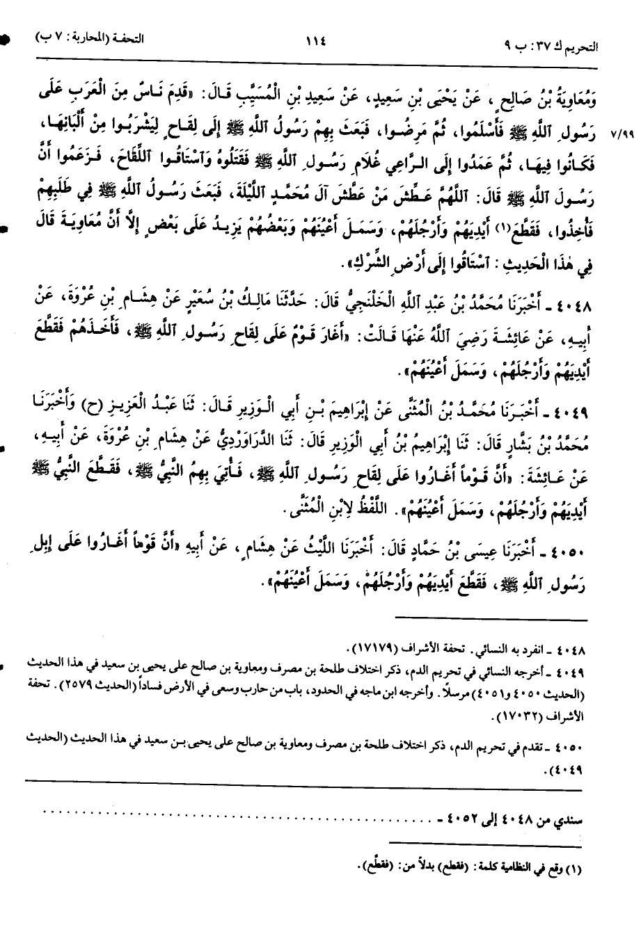 4050 - أَخْبَرَنَا عِيسَى بْنُ حَمَّادٍ قَالَ أَنْبَأَنَا اللَّيْثُ عَنْ هِشَامٍ عَنْ أَبِيهِ أَنَّ قَوْمًا أَغَارُوا عَلَى إِبِلِ رَسُولِ اللَّهِ صَلَّى اللَّهُ عَلَيْهِ وَسَلَّمَ فَقَطَّعَ أَيْدِيَهُمْ وَأَرْجُلَهُمْ وَسَمَلَ أَعْيُنَهُمْ