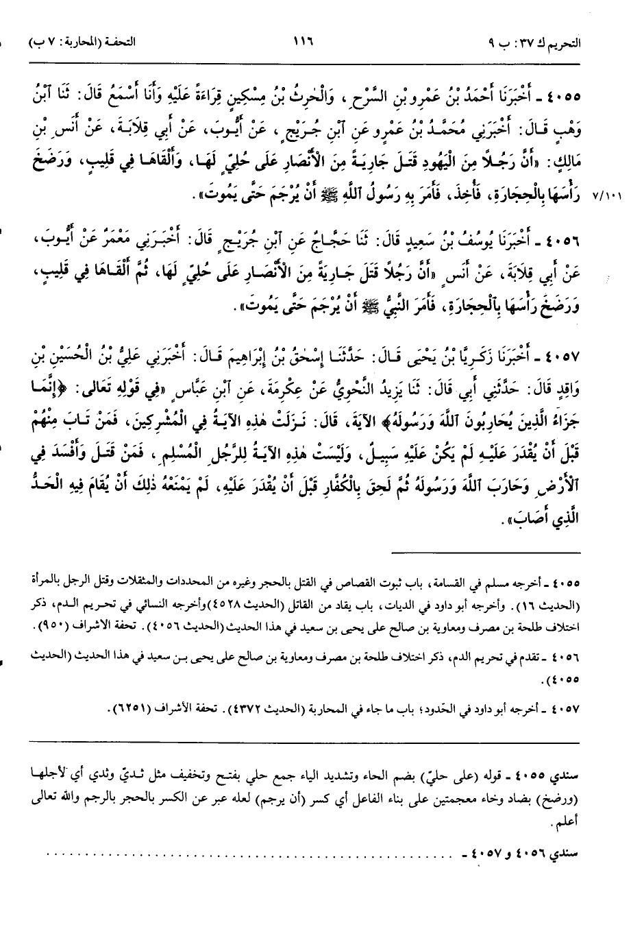 4055 - أَخْبَرَنَا أَحْمَدُ بْنُ عَمْرِو بْنِ السَّرْحِ وَالْحَارِثُ بْنُ مِسْكِينٍ قِرَاءَةً عَلَيْهِ وَأَنَا أَسْمَعُ قَالَ حَدَّثَنَا ابْنُ وَهْبٍ قَالَ أَخْبَرَنِي مُحَمَّدُ بْنُ عَمْرٍو عَنْ ابْنِ جُرَيْجٍ عَنْ أَيُّوبَ عَنْ أَبِي قِلَابَةَ عَنْ أَنَسِ بْنِ مَالِكٍ أَنَّ رَجُلًا مِنْ الْيَهُودِ قَتَلَ جَارِيَةً مِنْ الْأَنْصَارِ عَلَى حُلِيٍّ لَهَا وَأَلْقَاهَا فِي قَلِيبٍ وَرَضَخَ رَأْسَهَا بِالْحِجَارَةِ فَأُخِذَ فَأَمَرَ بِهِ رَسُولُ اللَّهِ صَلَّى اللَّهُ عَلَيْهِ وَسَلَّمَ أَنْ يُرْجَمَ حَتَّى يَمُوتَ
