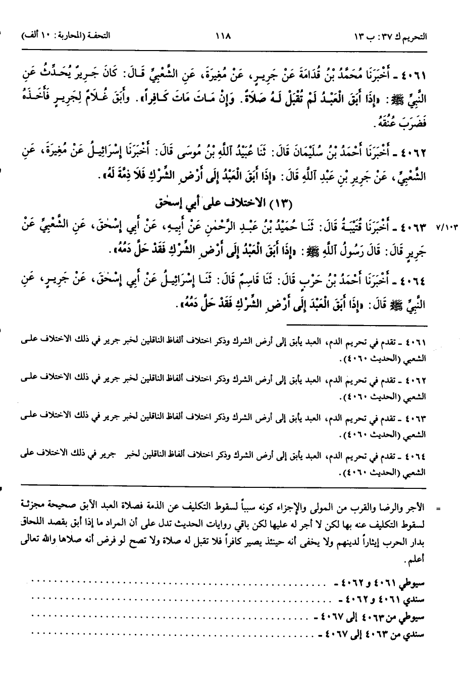 الِاخْتِلَافُ عَلَى أَبِي إِسْحَقَ 4063 - أَخْبَرَنَا قُتَيْبَةُ قَالَ حَدَّثَنَا حُمَيْدُ بْنُ عَبْدِ الرَّحْمَنِ عَنْ أَبِيهِ عَنْ أَبِي إِسْحَقَ عَنْ الشَّعْبِيِّ عَنْ جَرِيرٍ قَالَ قَالَ رَسُولُ اللَّهِ صَلَّى اللَّهُ عَلَيْهِ وَسَلَّمَ إِذَا أَبَقَ الْعَبْدُ إِلَى أَرْضِ الشِّرْكِ فَقَدْ حَلَّ دَمُهُ