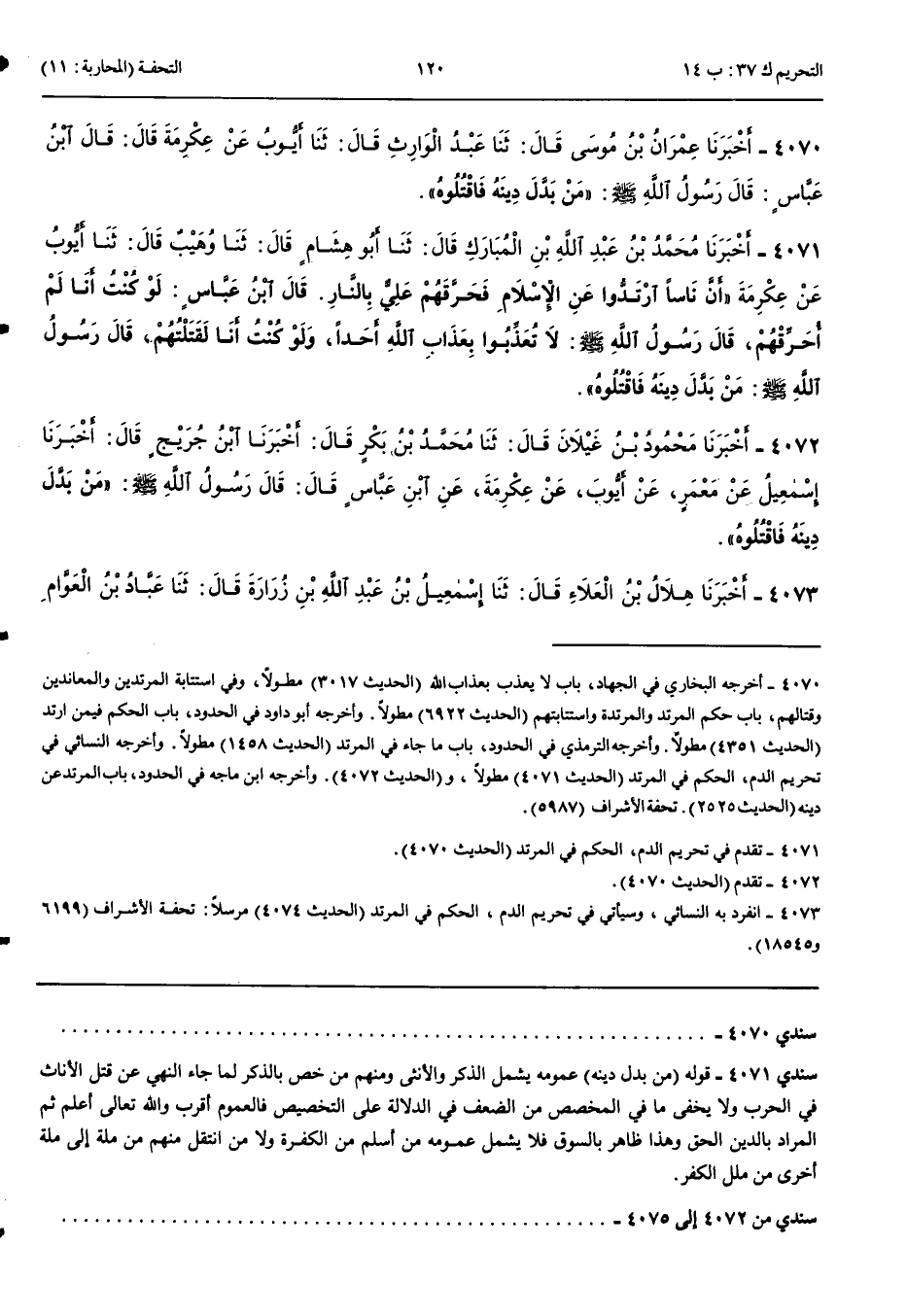 4071 - أَخْبَرَنَا مُحَمَّدُ بْنُ عَبْدِ اللَّهِ بْنِ الْمُبَارَكِ قَالَ حَدَّثَنَا أَبُو هِشَامٍ قَالَ حَدَّثَنَا وُهَيْبٌ قَالَ حَدَّثَنَا أَيُّوبُ عَنْ عِكْرِمَةَ أَنَّ نَاسًا ارْتَدُّوا عَنْ الْإِسْلَامِ فَحَرَّقَهُمْ عَلِيٌّ بِالنَّارِ قَالَ ابْنُ عَبَّاسٍ لَوْ كُنْتُ أَنَا لَمْ أُحَرِّقْهُمْ قَالَ رَسُولُ اللَّهِ صَلَّى اللَّهُ عَلَيْهِ وَسَلَّمَ لَا تُعَذِّبُوا بِعَذَابِ اللَّهِ أَحَدًا وَلَوْ كُنْتُ أَنَا لَقَتَلْتُهُمْ قَالَ رَسُولُ اللَّهِ صَلَّى اللَّهُ عَلَيْهِ وَسَلَّمَ مَنْ بَدَّلَ دِينَهُ فَاقْتُلُوهُ