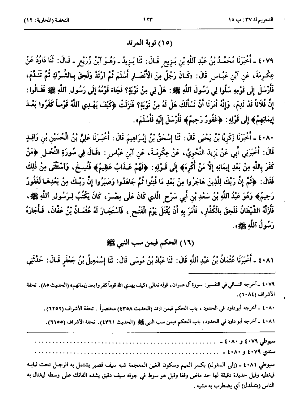 الْحُكْمُ فِيمَنْ سَبَّ النَّبِيَّ صَلَّى اللَّهُ عَلَيْهِ وَسَلَّمَ 4081 - أَخْبَرَنَا عُثْمَانُ بْنُ عَبْدِ اللَّهِ قَالَ حَدَّثَنَا عَبَّادُ بْنُ مُوسَى قَالَ حَدَّثَنَا إِسْمَعِيلُ بْنُ جَعْفَرٍ قَالَ حَدَّثَنِي إِسْرَائِيلُ عَنْ عُثْمَانَ الشَّحَّامِ قَالَ كُنْتُ أَقُودُ رَجُلًا أَعْمَى فَانْتَهَيْتُ إِلَى عِكْرِمَةَ فَأَنْشَأَ يُحَدِّثُنَا قَالَ حَدَّثَنِي ابْنُ عَبَّاسٍ أَنَّ أَعْمَى كَانَ عَلَى عَهْدِ رَسُولِ اللَّهِ صَلَّى اللَّهُ عَلَيْهِ وَسَلَّمَ وَكَانَتْ لَهُ أُمُّ وَلَدٍ وَكَانَ لَهُ مِنْهَا ابْنَانِ وَكَانَتْ تُكْثِرُ الْوَقِيعَةَ بِرَسُولِ اللَّهِ صَلَّى اللَّهُ عَلَيْهِ وَسَلَّمَ وَتَسُبُّهُ فَيَزْجُرُهَا فَلَا تَنْزَجِرُ وَيَنْهَاهَا فَلَا تَنْتَهِي فَلَمَّا كَانَ ذَاتَ لَيْلَةٍ ذَكَرْتُ النَّبِيَّ صَلَّى اللَّهُ عَلَيْهِ وَسَلَّمَ فَوَقَعَتْ فِيهِ فَلَمْ أَصْبِرْ أَنْ قُمْتُ إِلَى الْمِغْوَلِ فَوَضَعْتُهُ فِي بَطْنِهَا فَاتَّكَأْتُ عَلَيْهِ فَقَتَلْتُهَا فَأَصْبَحَتْ قَتِيلًا فَذُكِرَ ذَلِكَ لِلنَّبِيِّ صَلَّى اللَّهُ عَلَيْهِ وَسَلَّمَ فَجَمَعَ النَّاسَ وَقَالَ أَنْشُدُ اللَّهَ رَجُلًا لِي عَلَيْهِ حَقٌّ فَعَلَ مَا فَعَلَ إِلَّا قَامَ فَأَقْبَلَ الْأَعْمَى يَتَدَلْدَلُ فَقَالَ يَا رَسُولَ اللَّهِ أَنَا صَاحِبُهَا كَانَتْ أُمَّ وَلَدِي وَكَانَتْ بِي لَطِيفَةً رَفِيقَةً وَلِي مِنْهَا ابْنَانِ مِثْلُ اللُّؤْلُؤَتَيْنِ وَلَكِنَّهَا كَانَتْ تُكْثِرُ الْوَقِيعَةَ فِيكَ وَتَشْتُمُكَ فَأَنْهَاهَا فَلَا تَنْتَهِي وَأَزْجُرُهَا فَلَا تَنْزَجِرُ فَلَمَّا كَانَتْ الْبَارِحَةُ ذَكَرْتُكَ فَوَقَعَتْ فِيكَ فَقُمْتُ إِلَى الْمِغْوَلِ فَوَضَعْتُهُ فِي بَطْنِهَا فَاتَّكَأْتُ عَلَيْهَا حَتَّى قَتَلْتُهَا فَقَالَ رَسُولُ اللَّهِ صَلَّى اللَّهُ عَلَيْهِ وَسَلَّمَ أَلَا اشْهَدُوا أَنَّ دَمَهَا هَدَرٌ