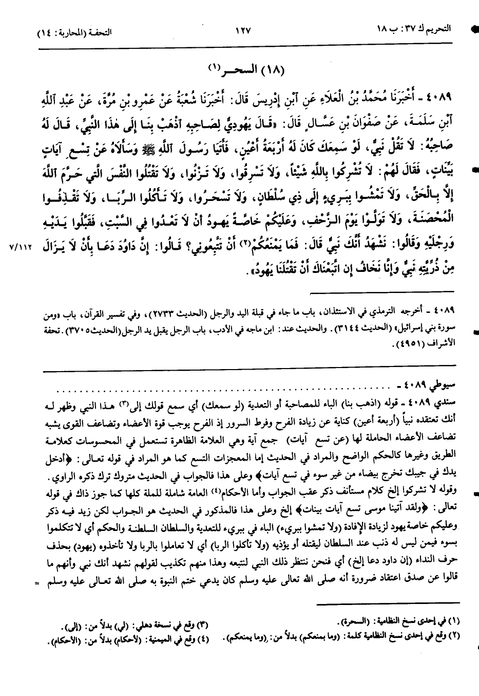 السِّحْرُ 4089 - أَخْبَرَنَا مُحَمَّدُ بْنُ الْعَلَاءِ عَنْ ابْنِ إِدْرِيسَ قَالَ أَنْبَأَنَا شُعْبَةُ عَنْ عَمْرِو بْنِ مُرَّةَ عَنْ عَبْدِ اللَّهِ بْنِ سَلَمَةَ عَنْ صَفْوَانَ بْنِ عَسَّالٍ قَالَ قَالَ يَهُودِيٌّ لِصَاحِبِهِ اذْهَبْ بِنَا إِلَى هَذَا النَّبِيِّ قَالَ لَهُ صَاحِبُهُ لَا تَقُلْ نَبِيٌّ لَوْ سَمِعَكَ كَانَ لَهُ أَرْبَعَةُ أَعْيُنٍ فَأَتَيَا رَسُولَ اللَّهِ صَلَّى اللَّهُ عَلَيْهِ وَسَلَّمَ وَسَأَلَاهُ عَنْ تِسْعِ آيَاتٍ بَيِّنَاتٍ فَقَالَ لَهُمْ لَا تُشْرِكُوا بِاللَّهِ شَيْئًا وَلَا تَسْرِقُوا وَلَا تَزْنُوا وَلَا تَقْتُلُوا النَّفْسَ الَّتِي حَرَّمَ اللَّهُ إِلَّا بِالْحَقِّ وَلَا تَمْشُوا بِبَرِيءٍ إِلَى ذِي سُلْطَانٍ وَلَا تَسْحَرُوا وَلَا تَأْكُلُوا الرِّبَا وَلَا تَقْذِفُوا الْمُحْصَنَةَ وَلَا تَوَلَّوْا يَوْمَ الزَّحْفِ وَعَلَيْكُمْ خَاصَّةً يَهُودُ أَنْ لَا تَعْدُوا فِي السَّبْتِ فَقَبَّلُوا يَدَيْهِ وَرِجْلَيْهِ وَقَالُوا نَشْهَدُ أَنَّكَ نَبِيٌّ قَالَ فَمَا يَمْنَعُكُمْ أَنْ تَتَّبِعُونِي قَالُوا إِنَّ دَاوُدَ دَعَا بِأَنْ لَا يَزَالَ مِنْ ذُرِّيَّتِهِ نَبِيٌّ وَإِنَّا نَخَافُ إِنْ اتَّبَعْنَاكَ أَنْ تَقْتُلَنَا يَهُودُ