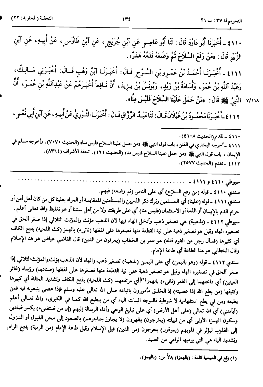 4110 - أَخْبَرَنَا أَبُو دَاوُدَ قَالَ حَدَّثَنَا أَبُو عَاصِمٍ عَنْ ابْنِ جُرَيْجٍ عَنْ ابْنِ طَاوُسٍ عَنْ أَبِيهِ عَنْ ابْنِ الزُّبَيْرِ قَالَ مَنْ رَفَعَ السِّلَاحَ ثُمَّ وَضَعَهُ فَدَمُهُ هَدَرٌ
