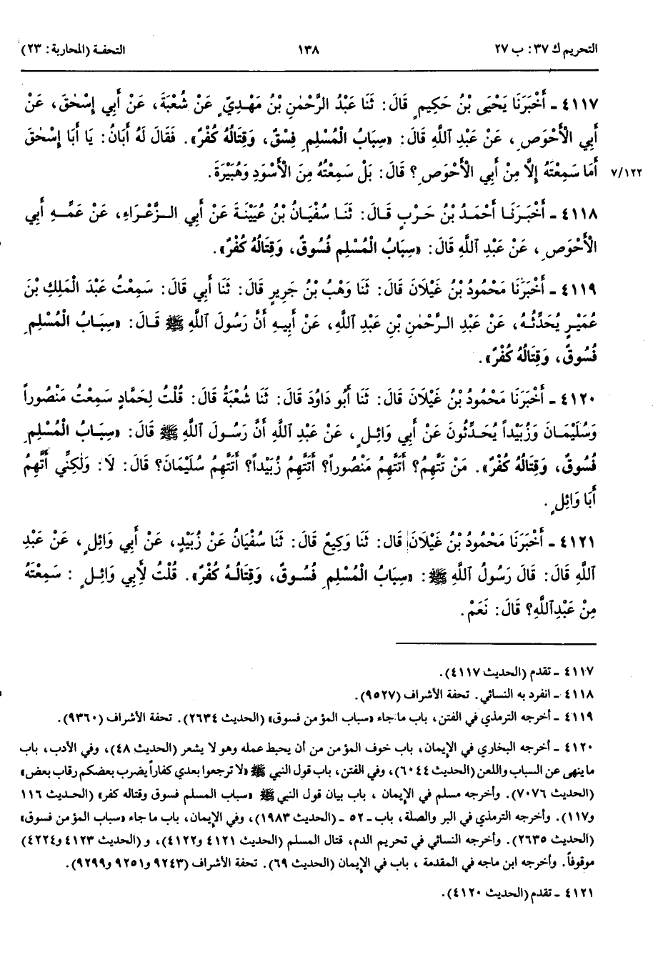 4118 - أَخْبَرَنَا أَحْمَدُ بْنُ حَرْبٍ قَالَ حَدَّثَنَا سُفْيَانُ بْنُ عُيَيْنَةَ عَنْ أَبِي الزَّعْرَاءِ عَنْ عَمِّهِ أَبِي الْأَحْوَصِ عَنْ عَبْدِ اللَّهِ قَالَ سِبَابُ الْمُسْلِمِ فُسُوقٌ وَقِتَالُهُ كُفْرٌ