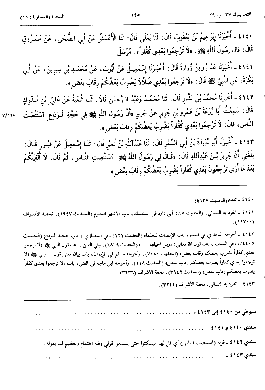 4142 - أَخْبَرَنَا مُحَمَّدُ بْنُ بَشَّارٍ قَالَ حَدَّثَنَا مُحَمَّدٌ وَعَبْدُ الرَّحْمَنِ قَالَا حَدَّثَنَا شُعْبَةُ عَنْ عَلِيِّ بْنِ مُدْرِكٍ قَالَ سَمِعْتُ أَبَا زُرْعَةَ بْنَ عَمْرِو بْنِ جَرِيرٍ عَنْ جَرِيرٍ أَنَّ رَسُولَ اللَّهِ صَلَّى اللَّهُ عَلَيْهِ وَسَلَّمَ فِي حَجَّةِ الْوَدَاعِ اسْتَنْصَتَ النَّاسَ قَالَ لَا تَرْجِعُوا بَعْدِي كُفَّارًا يَضْرِبُ بَعْضُكُمْ رِقَابَ بَعْضٍ