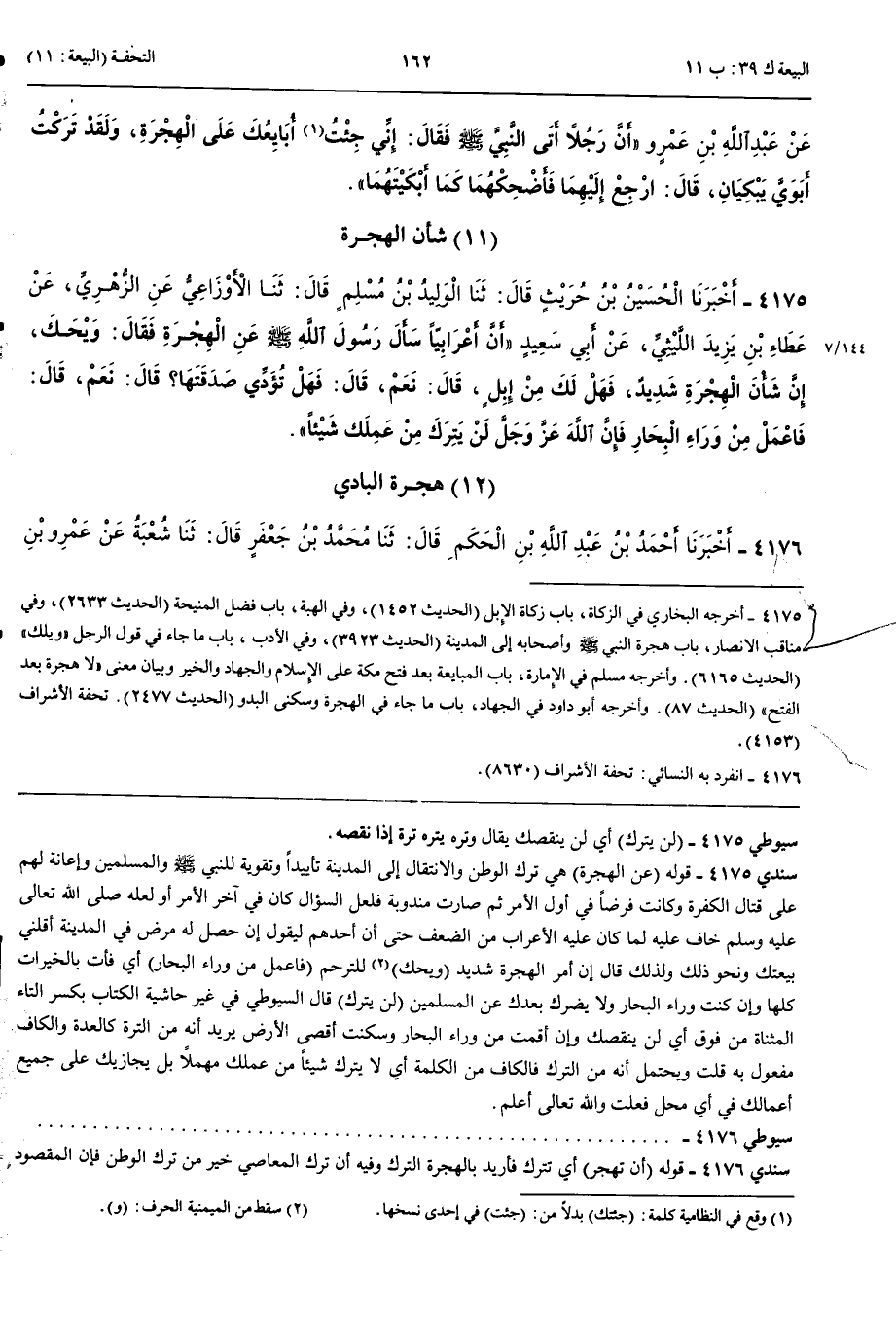 هِجْرَةُ الْبَادِي 4176 - أَخْبَرَنَا أَحْمَدُ بْنُ عَبْدِ اللَّهِ بْنِ الْحَكَمِ قَالَ حَدَّثَنَا مُحَمَّدُ بْنُ جَعْفَرٍ قَالَ حَدَّثَنَا شُعْبَةُ عَنْ عَمْرِو بْنِ مُرَّةَ عَنْ عَبْدِ اللَّهِ بْنِ الْحَارِثِ عَنْ أَبِي كَثِيرٍ عَنْ عَبْدِ اللَّهِ بْنِ عَمْرٍو قَالَ قَالَ رَجُلٌ يَا رَسُولَ اللَّهِ أَيُّ الْهِجْرَةِ أَفْضَلُ قَالَ أَنْ تَهْجُرَ مَا كَرِهَ رَبُّكَ عَزَّ وَجَلَّ وَقَالَ رَسُولُ اللَّهِ صَلَّى اللَّهُ عَلَيْهِ وَسَلَّمَ الْهِجْرَةُ هِجْرَتَانِ هِجْرَةُ الْحَاضِرِ وَهِجْرَةُ الْبَادِي فَأَمَّا الْبَادِي فَيُجِيبُ إِذَا دُعِيَ وَيُطِيعُ إِذَا أُمِرَ وَأَمَّا الْحَاضِرُ فَهُوَ أَعْظَمُهُمَا بَلِيَّةً وَأَعْظَمُهُمَا أَجْرًا