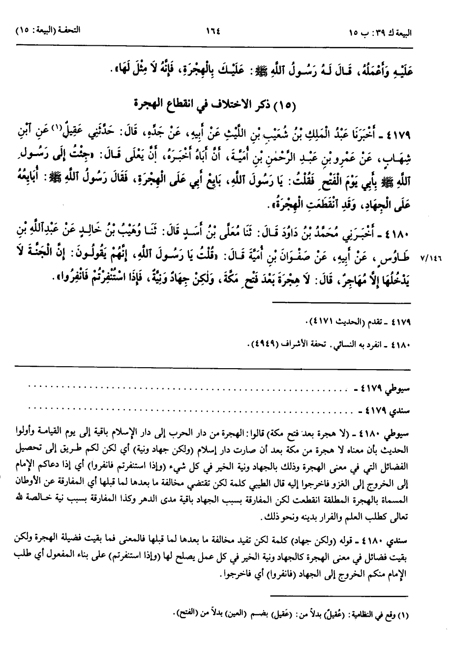 ذِكْرُ الِاخْتِلَافِ فِي انْقِطَاعِ الْهِجْرَةِ 4179 - أَخْبَرَنَا عَبْدُ الْمَلِكِ بْنُ شُعَيْبِ بْنِ اللَّيْثِ عَنْ أَبِيهِ عَنْ جَدِّهِ قَالَ حَدَّثَنِي عُقَيْلٌ عَنْ ابْنِ شِهَابٍ عَنْ عَمْرِو بْنِ عَبْدِ الرَّحْمَنِ بْنِ أُمَيَّةَ أَنَّ أَبَاهُ أَخْبَرَهُ أَنَّ يَعْلَى قَالَ جِئْتُ إِلَى رَسُولِ اللَّهِ صَلَّى اللَّهُ عَلَيْهِ وَسَلَّمَ بِأَبِي يَوْمَ الْفَتْحِ فَقُلْتُ يَا رَسُولَ اللَّهِ بَايِعْ أَبِي عَلَى الْهِجْرَةِ قَالَ رَسُولُ اللَّهِ صَلَّى اللَّهُ عَلَيْهِ وَسَلَّمَ أُبَايِعُهُ عَلَى الْجِهَادِ وَقَدْ انْقَطَعَتْ الْهِجْرَةُ