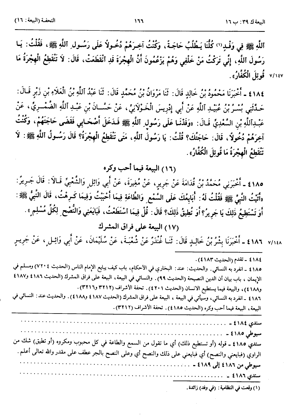 الْبَيْعَةُ فِيمَا أَحَبَّ وَكَرِهَ 4185 - أَخْبَرَنِي مُحَمَّدُ بْنُ قُدَامَةَ عَنْ جَرِيرٍ عَنْ مُغِيرَةَ عَنْ أَبِي وَائِلٍ وَالشَّعْبِيِّ قَالَا قَالَ جَرِيرٌ أَتَيْتُ النَّبِيَّ صَلَّى اللَّهُ عَلَيْهِ وَسَلَّمَ فَقُلْتُ لَهُ أُبَايِعُكَ عَلَى السَّمْعِ وَالطَّاعَةِ فِيمَا أَحْبَبْتُ وَفِيمَا كَرِهْتُ قَالَ النَّبِيُّ صَلَّى اللَّهُ عَلَيْهِ وَسَلَّمَ أَوَ تَسْتَطِيعُ ذَلِكَ يَا جَرِيرُ أَوَ تُطِيقُ ذَلِكَ قَالَ قُلْ فِيمَا اسْتَطَعْتُ فَبَايَعَنِي وَالنُّصْحِ لِكُلِّ مُسْلِمٍ