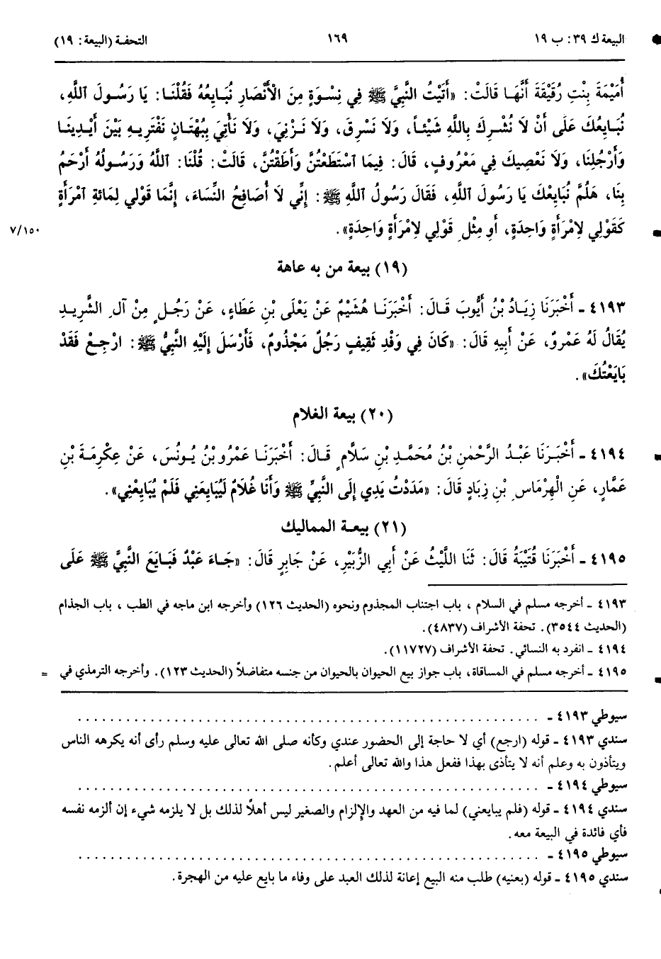 بَيْعَةُ الْمَمَالِيكِ 4195 - أَخْبَرَنَا قُتَيْبَةُ قَالَ حَدَّثَنَا اللَّيْثُ عَنْ أَبِي الزُّبَيْرِ عَنْ جَابِرٍ قَالَ جَاءَ عَبْدٌ فَبَايَعَ النَّبِيَّ صَلَّى اللَّهُ عَلَيْهِ وَسَلَّمَ عَلَى الْهِجْرَةِ وَلَا يَشْعُرُ النَّبِيُّ صَلَّى اللَّهُ عَلَيْهِ وَسَلَّمَ أَنَّهُ عَبْدٌ فَجَاءَ سَيِّدُهُ يُرِيدُهُ فَقَالَ النَّبِيُّ صَلَّى اللَّهُ عَلَيْهِ وَسَلَّمَ بِعْنِيهِ فَاشْتَرَاهُ بِعَبْدَيْنِ أَسْوَدَيْنِ ثُمَّ لَمْ يُبَايِعْ أَحَدًا حَتَّى يَسْأَلَهُ أَعَبْدٌ هُوَ