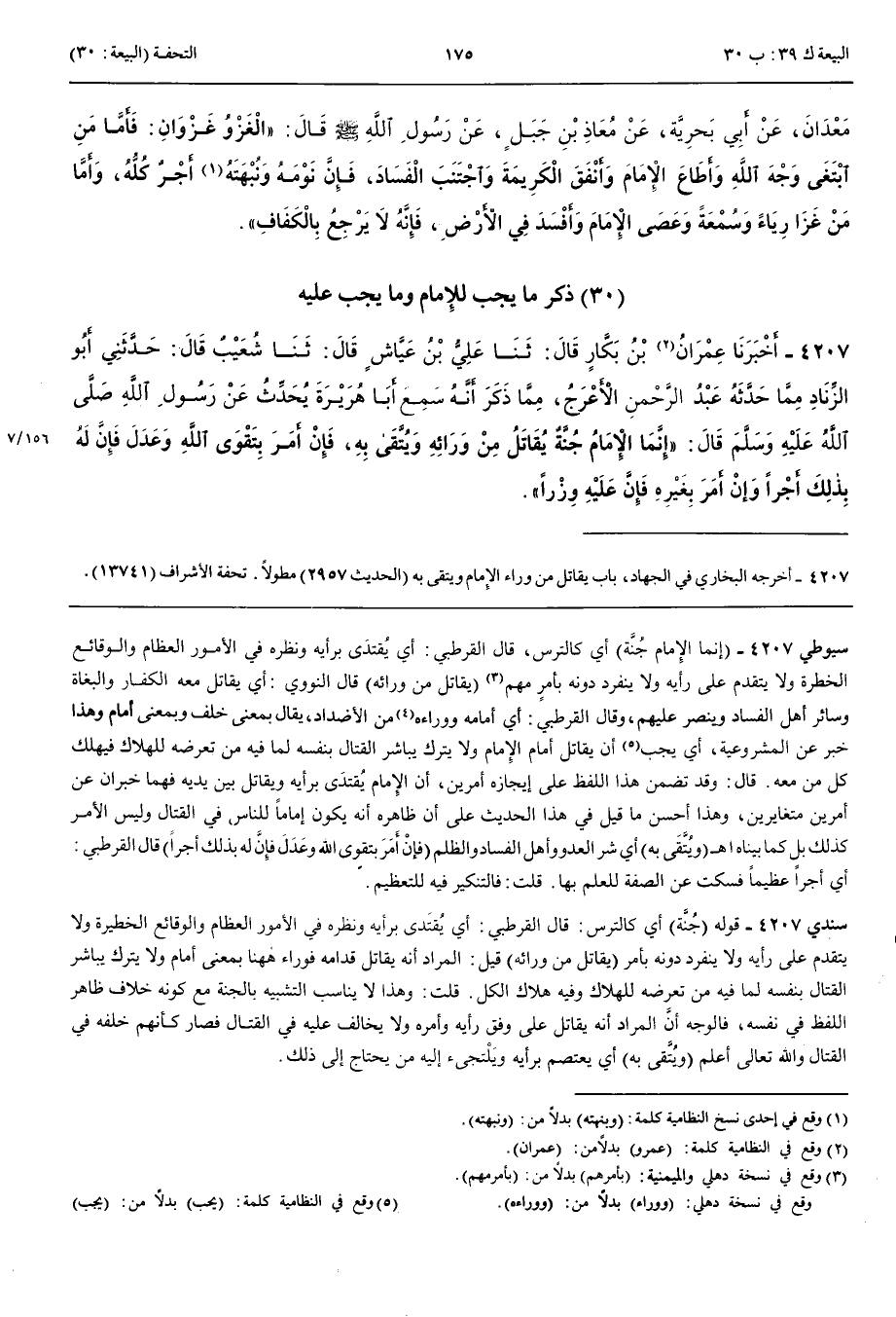 ذِكْرُ مَا يَجِبُ لِلْإِمَامِ وَمَا يَجِبُ عَلَيْهِ 4207 - أَخْبَرَنَا عِمْرَانُ بْنُ بَكَّارٍ قَالَ حَدَّثَنَا عَلِيُّ بْنُ عَيَّاشٍ قَالَ حَدَّثَنَا شُعَيْبٌ قَالَ حَدَّثَنِي أَبُو الزِّنَادِ مِمَّا حَدَّثَهُ عَبْدُ الرَّحْمَنِ الْأَعْرَجُ مِمَّا ذَكَرَ أَنَّهُ سَمِعَ أَبَا هُرَيْرَةَ يُحَدِّثُ عَنْ رَسُولِ اللَّهِ صَلَّى اللَّهُ عَلَيْهِ وَسَلَّمَ قَالَ إِنَّمَا الْإِمَامُ جُنَّةٌ يُقَاتَلُ مِنْ وَرَائِهِ وَيُتَّقَى بِهِ فَإِنْ أَمَرَ بِتَقْوَى اللَّهِ وَعَدَلَ فَإِنَّ لَهُ بِذَلِكَ أَجْرًا وَإِنْ أَمَرَ بِغَيْرِهِ فَإِنَّ عَلَيْهِ وِزْرًا