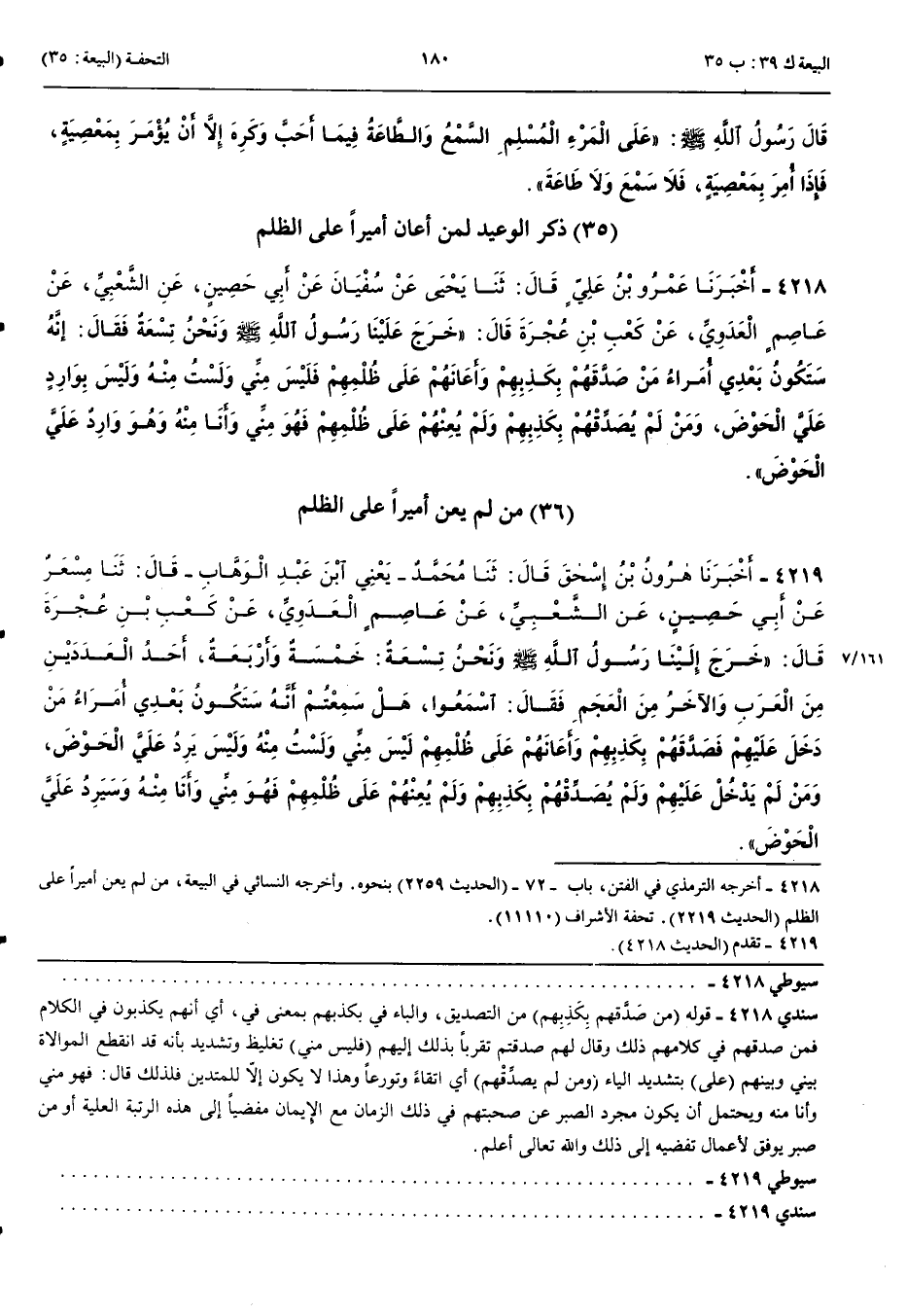 مَنْ لَمْ يُعِنْ أَمِيرًا عَلَى الظُّلْمِ 4219 - أَخْبَرَنَا هَارُونُ بْنُ إِسْحَقَ قَالَ حَدَّثَنَا مُحَمَّدٌ يَعْنِي ابْنَ عَبْدِ الْوَهَّابِ قَالَ حَدَّثَنَا مِسْعَرٌ عَنْ أَبِي حَصِينٍ عَنْ الشَّعْبِيِّ عَنْ عَاصِمٍ الْعَدَوِيِّ عَنْ كَعْبِ بْنِ عُجْرَةَ قَالَ خَرَجَ إِلَيْنَا رَسُولُ اللَّهِ صَلَّى اللَّهُ عَلَيْهِ وَسَلَّمَ وَنَحْنُ تِسْعَةٌ خَمْسَةٌ وَأَرْبَعَةٌ أَحَدُ الْعَدَدَيْنِ مِنْ الْعَرَبِ وَالْآخَرُ مِنْ الْعَجَمِ فَقَالَ اسْمَعُوا هَلْ سَمِعْتُمْ أَنَّهُ سَتَكُونُ بَعْدِي أُمَرَاءُ مَنْ دَخَلَ عَلَيْهِمْ فَصَدَّقَهُمْ بِكَذِبِهِمْ وَأَعَانَهُمْ عَلَى ظُلْمِهِمْ فَلَيْسَ مِنِّي وَلَسْتُ مِنْهُ وَلَيْسَ يَرِدُ عَلَيَّ الْحَوْضَ وَمَنْ لَمْ يَدْخُلْ عَلَيْهِمْ وَلَمْ يُصَدِّقْهُمْ بِكَذِبِهِمْ وَلَمْ يُعِنْهُمْ عَلَى ظُلْمِهِمْ فَهُوَ مِنِّي وَأَنَا مِنْهُ وَسَيَرِدُ عَلَيَّ الْحَوْضَ