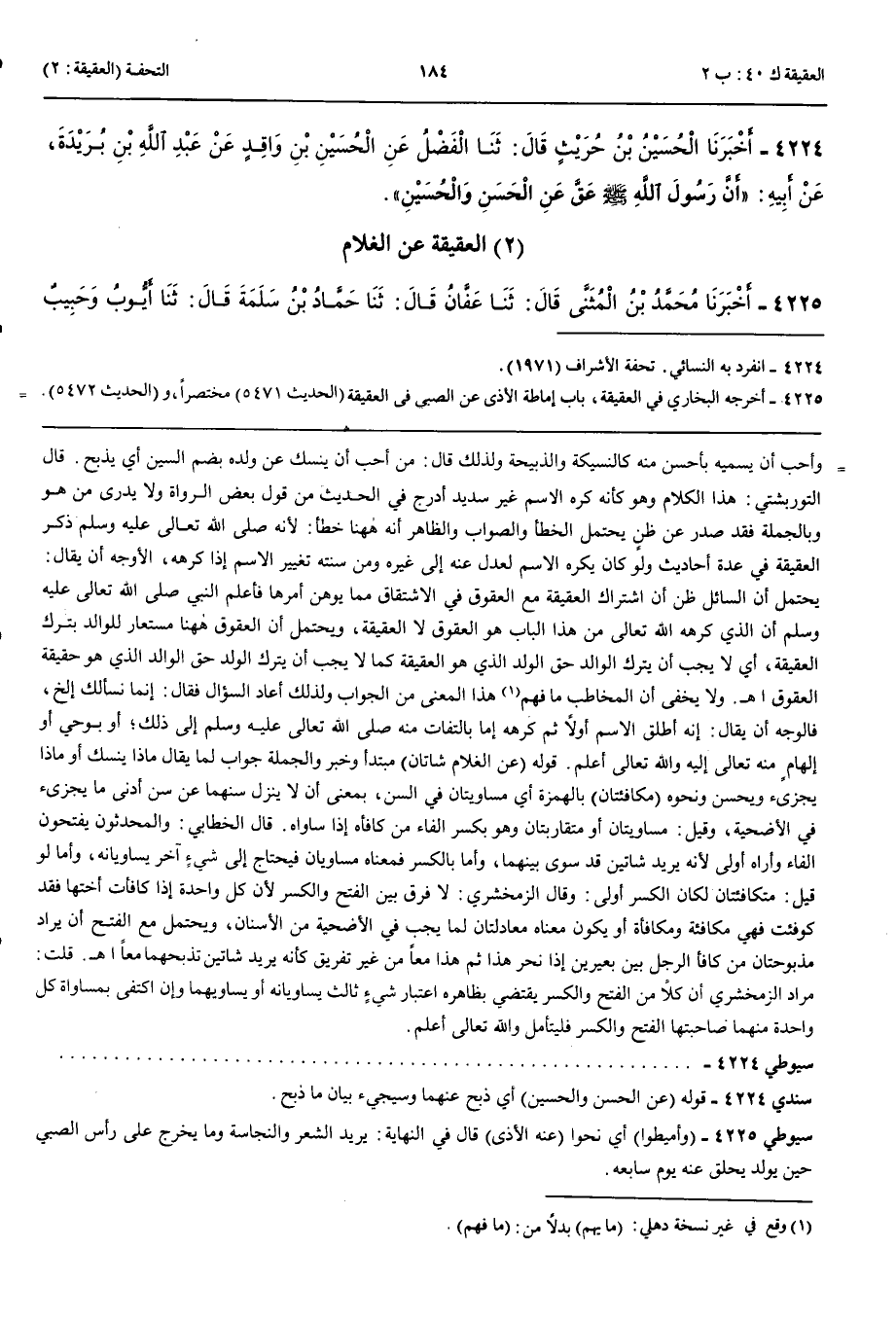 4224 - أَخْبَرَنَا الْحُسَيْنُ بْنُ حُرَيْثٍ قَالَ حَدَّثَنَا الْفَضْلُ عَنْ الْحُسَيْنِ بْنِ وَاقِدٍ عَنْ عَبْدِ اللَّهِ بْنِ بُرَيْدَةَ عَنْ أَبِيهِ أَنَّ رَسُولَ اللَّهِ صَلَّى اللَّهُ عَلَيْهِ وَسَلَّمَ عَقَّ عَنْ الْحَسَنِ وَالْحُسَيْنِ