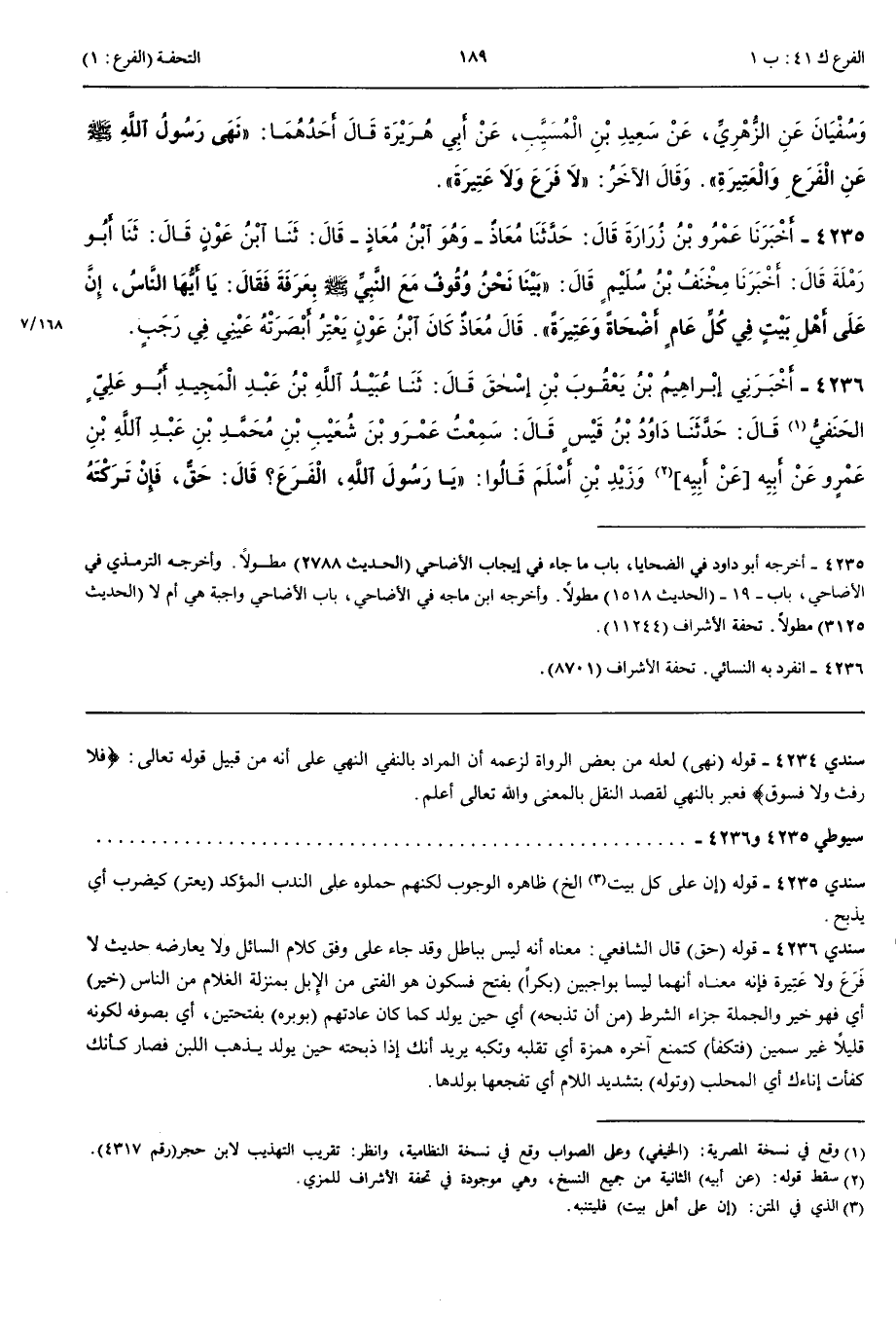 4236 - أَخْبَرَنِي إِبْرَاهِيمُ بْنُ يَعْقُوبَ بْنِ إِسْحَقَ قَالَ حَدَّثَنَا عُبَيْدُ اللَّهِ بْنُ عَبْدِ الْمَجِيدِ أَبُو عَلِيٍّ الْحَنَفِيُّ قَالَ حَدَّثَنَا دَاوُدُ بْنُ قَيْسٍ قَالَ سَمِعْتُ عَمْرَو بْنَ شُعَيْبِ بْنِ مُحَمَّدِ بْنِ عَبْدِ اللَّهِ بْنِ عَمْرٍو عَنْ أَبِيهِ عَنْ أَبِيهِ وَزَيْدِ بْنِ أَسْلَمَ قَالُوا يَا رَسُولَ اللَّهِ الْفَرَعَ قَالَ حَقٌّ فَإِنْ تَرَكْتَهُ حَتَّى يَكُونَ بَكْرًا فَتَحْمِلَ عَلَيْهِ فِي سَبِيلِ اللَّهِ أَوْ تُعْطِيَهُ أَرْمَلَةً خَيْرٌ مِنْ أَنْ تَذْبَحَهُ فَيَلْصَقَ لَحْمُهُ بِوَبَرِهِ فَتُكْفِئَ إِنَاءَكَ وَتُولِهُ نَاقَتَكَ قَالُوا يَا رَسُولَ اللَّهِ فَالْعَتِيرَةُ قَالَ الْعَتِيرَةُ حَقٌّ قَالَ أَبُو عَبْد الرَّحْمَنِ أَبُو عَلِيٍّ الْحَنَفِيُّ هُمْ أَرْبَعَةُ إِخْوَةٍ أَحَدُهُمْ أَبُو بَكْرٍ وَبِشْرٌ وَشَرِيكٌ وَآخَرُ