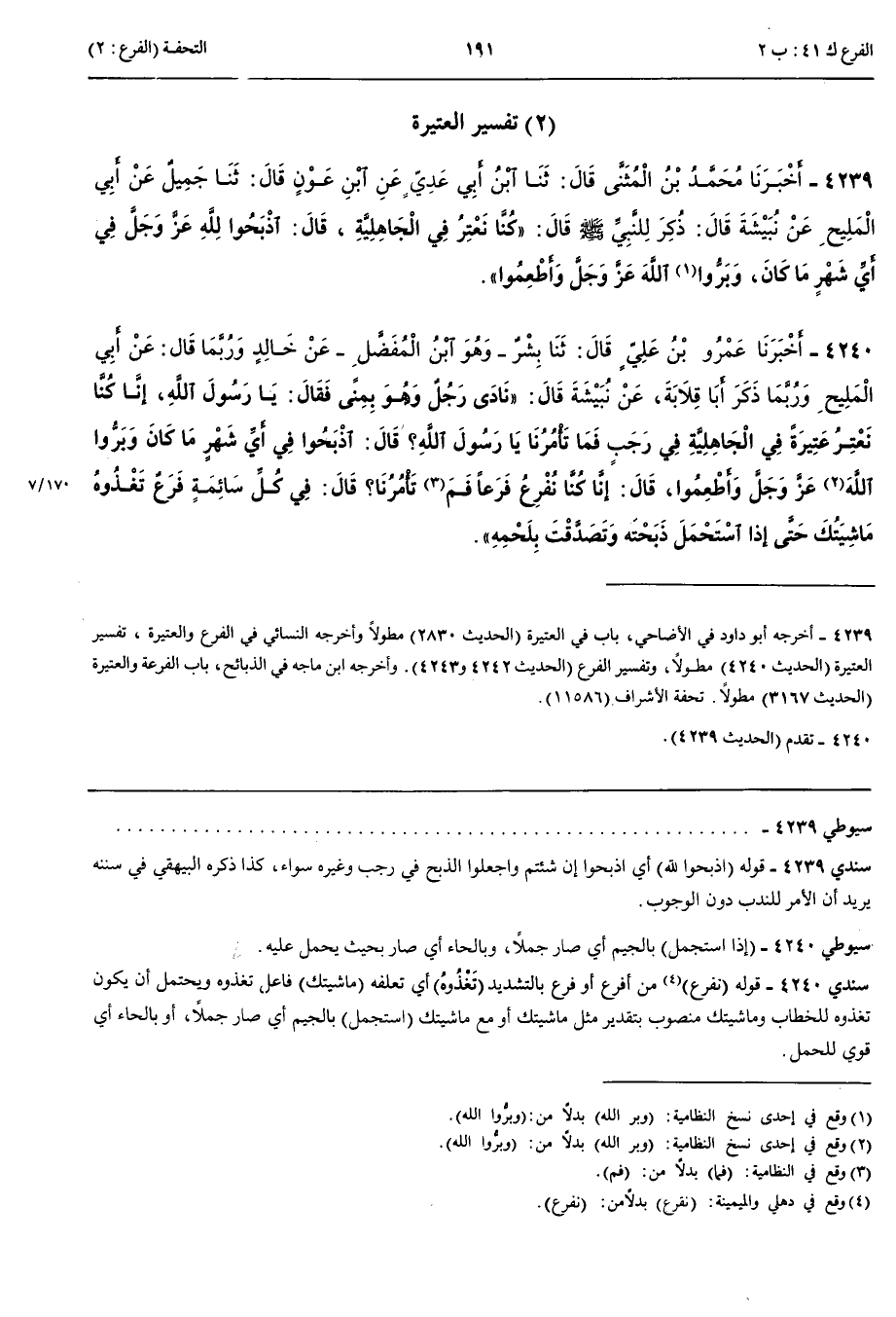 تَفْسِيرُ الْعَتِيرَةِ 4239 - أَخْبَرَنَا مُحَمَّدُ بْنُ الْمُثَنَّى قَالَ حَدَّثَنَا ابْنُ أَبِي عَدِيٍّ عَنْ ابْنِ عَوْنٍ قَالَ حَدَّثَنَا جَمِيلٌ عَنْ أَبِي الْمَلِيحِ عَنْ نُبَيْشَةَ قَالَ ذُكِرَ لِلنَّبِيِّ صَلَّى اللَّهُ عَلَيْهِ وَسَلَّمَ قَالَ كُنَّا نَعْتِرُ فِي الْجَاهِلِيَّةِ قَالَ اذْبَحُوا لِلَّهِ عَزَّ وَجَلَّ فِي أَيِّ شَهْرٍ مَا كَانَ وَبَرُّوا اللَّهَ عَزَّ وَجَلَّ وَأَطْعِمُوا