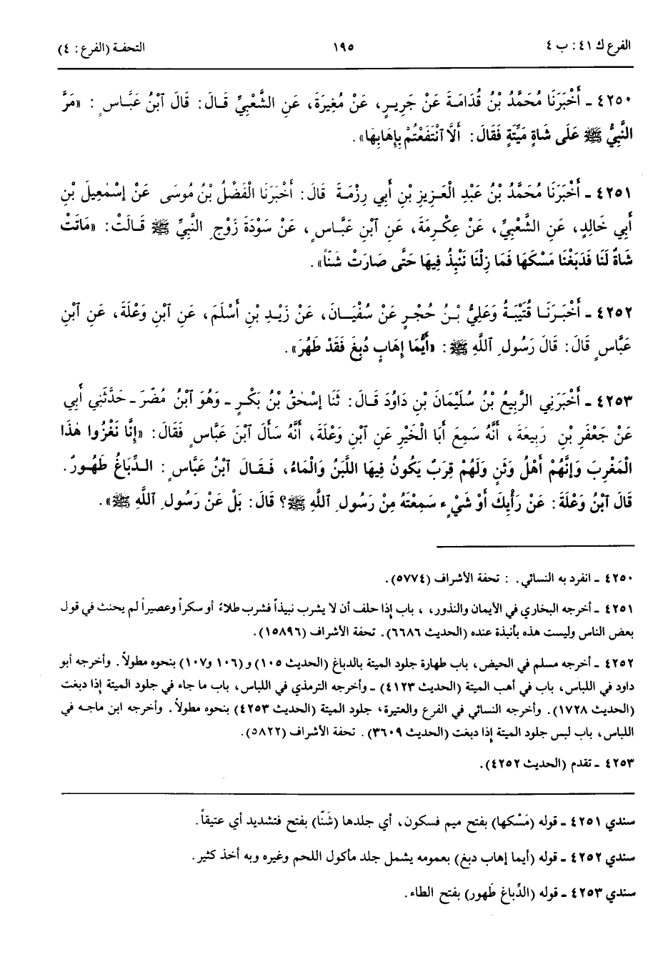 4250 - أَخْبَرَنَا مُحَمَّدُ بْنُ قُدَامَةَ عَنْ جَرِيرٍ عَنْ مُغِيرَةَ عَنْ الشَّعْبِيِّ قَالَ قَالَ ابْنُ عَبَّاسٍ مَرَّ النَّبِيُّ صَلَّى اللَّهُ عَلَيْهِ وَسَلَّمَ عَلَى شَاةٍ مَيِّتَةٍ فَقَالَ أَلَّا انْتَفَعْتُمْ بِإِهَابِهَا