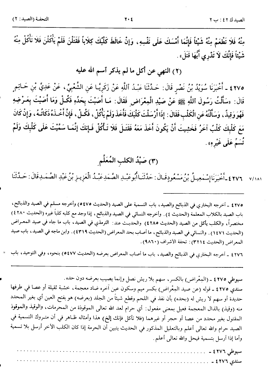 النَّهْيُ عَنْ أَكْلِ مَا لَمْ يُذْكَرْ اسْمُ اللَّهِ عَلَيْهِ 4275 - أَخْبَرَنَا سُوَيْدُ بْنُ نَصْرٍ قَالَ حَدَّثَنَا عَبْدُ اللَّهِ عَنْ زَكَرِيَّا عَنْ الشَّعْبِيِّ عَنْ عَدِيِّ بْنِ حَاتِمٍ قَالَ سَأَلْتُ رَسُولَ اللَّهِ صَلَّى اللَّهُ عَلَيْهِ وَسَلَّمَ عَنْ صَيْدِ الْمِعْرَاضِ فَقَالَ مَا أَصَبْتَ بِحَدِّهِ فَكُلْ وَمَا أَصَبْتَ بِعَرْضِهِ فَهُوَ وَقِيذٌ وَسَأَلْتُهُ عَنْ الْكَلْبِ فَقَالَ إِذَا أَرْسَلْتَ كَلْبَكَ فَأَخَذَ وَلَمْ يَأْكُلْ فَكُلْ فَإِنَّ أَخْذَهُ ذَكَاتُهُ وَإِنْ كَانَ مَعَ كَلْبِكَ كَلْبٌ آخَرُ فَخَشِيتَ أَنْ يَكُونَ أَخَذَ مَعَهُ فَقَتَلَ فَلَا تَأْكُلْ فَإِنَّكَ إِنَّمَا سَمَّيْتَ عَلَى كَلْبِكَ وَلَمْ تُسَمِّ عَلَى غَيْرِهِ