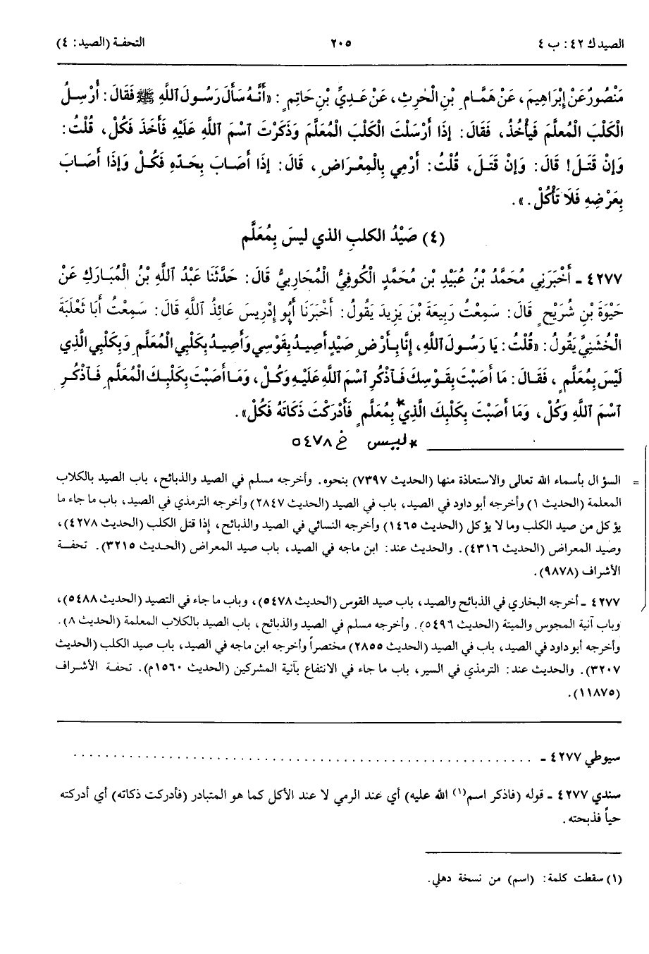صَيْدُ الْكَلْبِ الَّذِي لَيْسَ بِمُعَلَّمٍ 4277 - أَخْبَرَنِي مُحَمَّدُ بْنُ عُبَيْدِ بْنِ مُحَمَّدٍ الْكُوفِيُّ الْمُحَارِبِيُّ قَالَ حَدَّثَنَا عَبْدُ اللَّهِ بْنُ الْمُبَارَكِ عَنْ حَيْوَةَ بْنِ شُرَيْحٍ قَالَ سَمِعْتُ رَبِيعَةَ بْنَ يَزِيدَ يَقُولُ أَنْبَأَنَا أَبُو إِدْرِيسَ عَائِذُ اللَّهِ قَالَ سَمِعْتُ أَبَا ثَعْلَبَةَ الْخُشَنِيَّ يَقُولُ قُلْتُ يَا رَسُولَ اللَّهِ إِنَّا بِأَرْضِ صَيْدٍ أَصِيدُ بِقَوْسِي وَأَصِيدُ بِكَلْبِي الْمُعَلَّمِ وَبِكَلْبِي الَّذِي لَيْسَ بِمُعَلَّمٍ فَقَالَ مَا أَصَبْتَ بِقَوْسِكَ فَاذْكُرْ اسْمَ اللَّهِ عَلَيْهِ وَكُلْ وَمَا أَصَبْتَ بِكَلْبِكَ الْمُعَلَّمِ فَاذْكُرْ اسْمَ اللَّهِ وَكُلْ وَمَا أَصَبْتَ بِكَلْبِكَ الَّذِي لَيْسَ بِمُعَلَّمٍ فَأَدْرَكْتَ ذَكَاتَهُ فَكُلْ