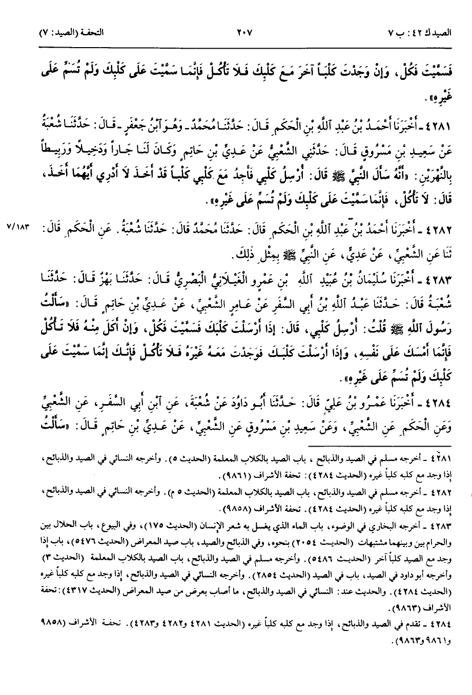 4281 - أَخْبَرَنَا أَحْمَدُ بْنُ عَبْدِ اللَّهِ بْنِ الْحَكَمِ قَالَ حَدَّثَنَا مُحَمَّدٌ وَهُوَ ابْنُ جَعْفَرٍ قَالَ حَدَّثَنَا شُعْبَةُ عَنْ سَعِيدِ بْنِ مَسْرُوقٍ قَالَ حَدَّثَنَا الشَّعْبِيُّ عَنْ عَدِيِّ بْنِ حَاتِمٍ وَكَانَ لَنَا جَارًا وَدَخِيلًا وَرَبِيطًا بِالنَّهْرَيْنِ أَنَّهُ سَأَلَ النَّبِيَّ صَلَّى اللَّهُ عَلَيْهِ وَسَلَّمَ قَالَ أُرْسِلُ كَلْبِي فَأَجِدُ مَعَ كَلْبِي كَلْبًا قَدْ أَخَذَ لَا أَدْرِي أَيَّهُمَا أَخَذَ قَالَ لَا تَأْكُلْ فَإِنَّمَا سَمَّيْتَ عَلَى كَلْبِكَ وَلَمْ تُسَمِّ عَلَى غَيْرِهِ 4282 - أَخْبَرَنَا أَحْمَدُ بْنُ عَبْدِ اللَّهِ بْنِ الْحَكَمِ قَالَ حَدَّثَنَا مُحَمَّدٌ قَالَ حَدَّثَنَا شُعْبَةُ عَنْ الْحَكَمِ قَالَ حَدَّثَنَا عَنْ الشَّعْبِيِّ عَنْ عَدِيٍّ عَنْ النَّبِيِّ صَلَّى اللَّهُ عَلَيْهِ وَسَلَّمَ بِمِثْلِ ذَلِكَ