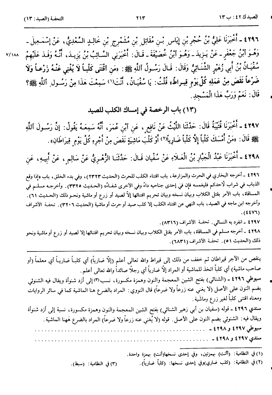 4298 - أَخْبَرَنَا عَبْدُ الْجَبَّارِ بْنُ الْعَلَاءِ عَنْ سُفْيَانَ قَالَ حَدَّثَنَا الزُّهْرِيُّ عَنْ سَالِمٍ عَنْ أَبِيهِ عَنْ النَّبِيِّ صَلَّى اللَّهُ عَلَيْهِ وَسَلَّمَ قَالَ مَنْ اقْتَنَى كَلْبًا إِلَّا كَلْبَ صَيْدٍ أَوْ مَاشِيَةٍ نَقَصَ مِنْ أَجْرِهِ كُلَّ يَوْمٍ قِيرَاطَانِ