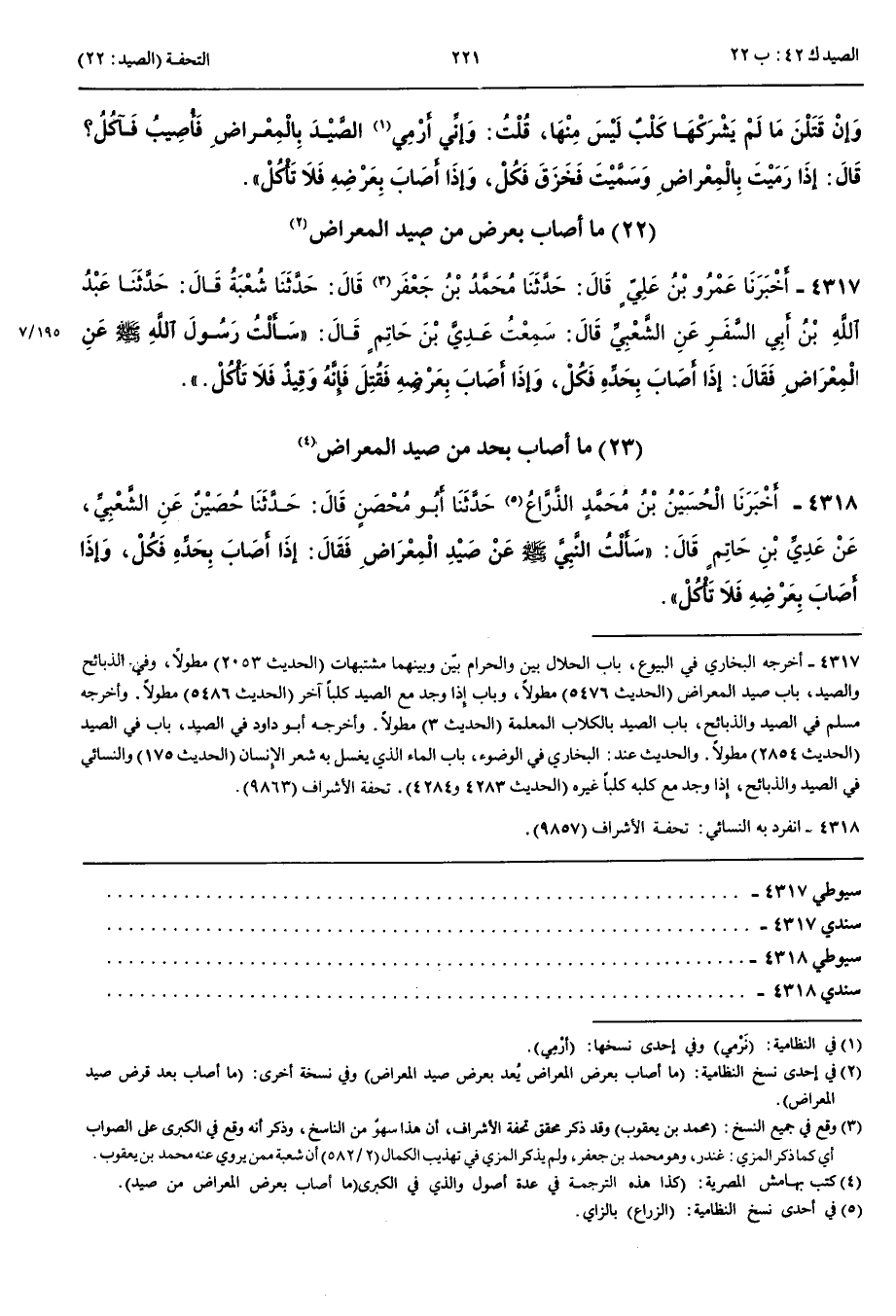 مَا أَصَابَ بِحَدٍّ مِنْ صَيْدِ الْمِعْرَاضِ 4318 - أَخْبَرَنَا الْحُسَيْنُ بْنُ مُحَمَّدٍ الذَّرَّاعُ قَالَ حَدَّثَنَا أَبُو مُحْصَنٍ قَالَ حَدَّثَنَا حُصَيْنٌ عَنْ الشَّعْبِيِّ عَنْ عَدِيِّ بْنِ حَاتِمٍ قَالَ سَأَلْتُ رَسُولَ اللَّهِ صَلَّى اللَّهُ عَلَيْهِ وَسَلَّمَ عَنْ صَيْدِ الْمِعْرَاضِ فَقَالَ إِذَا أَصَابَ بِحَدِّهِ فَكُلْ وَإِذَا أَصَابَ بِعَرْضِهِ فَلَا تَأْكُلْ