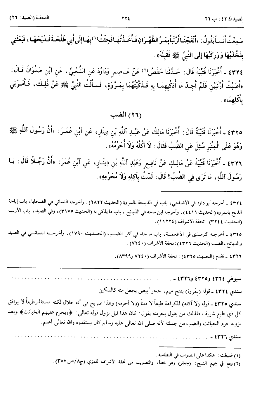 4326 - أَخْبَرَنَا قُتَيْبَةُ عَنْ مَالِكٍ عَنْ نَافِعٍ وَعَبْدِ اللَّهِ بْنِ دِينَارٍ عَنْ ابْنِ عُمَرَ أَنَّ رَجُلًا قَالَ يَا رَسُولَ اللَّهِ مَا تَرَى فِي الضَّبِّ قَالَ لَسْتُ بِآكِلِهِ وَلَا مُحَرِّمِهِ