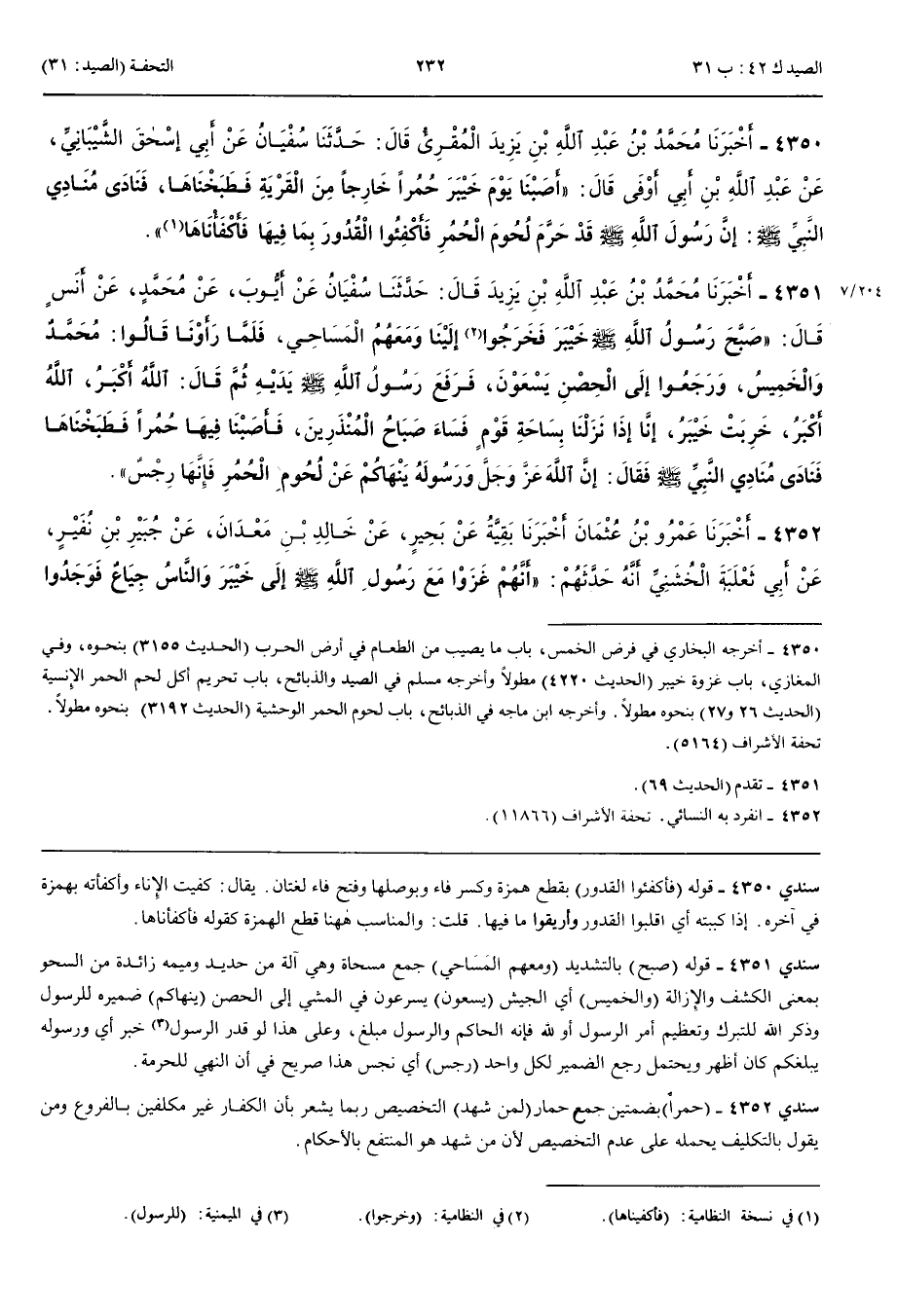4350 - أَخْبَرَنَا مُحَمَّدُ بْنُ عَبْدِ اللَّهِ بْنِ يَزِيدَ الْمُقْرِئُ قَالَ حَدَّثَنَا سُفْيَانُ عَنْ أَبِي إِسْحَقَ الشَّيْبَانِيِّ عَنْ عَبْدِ اللَّهِ بْنِ أَبِي أَوْفَى قَالَ أَصَبْنَا يَوْمَ خَيْبَرَ حُمُرًا خَارِجًا مِنْ الْقَرْيَةِ فَطَبَخْنَاهَا فَنَادَى مُنَادِي النَّبِيِّ صَلَّى اللَّهُ عَلَيْهِ وَسَلَّمَ إِنَّ رَسُولَ اللَّهِ صَلَّى اللَّهُ عَلَيْهِ وَسَلَّمَ قَدْ حَرَّمَ لُحُومَ الْحُمُرِ فَأَكْفِئُوا الْقُدُورَ بِمَا فِيهَا فَأَكْفَأْنَاهَا